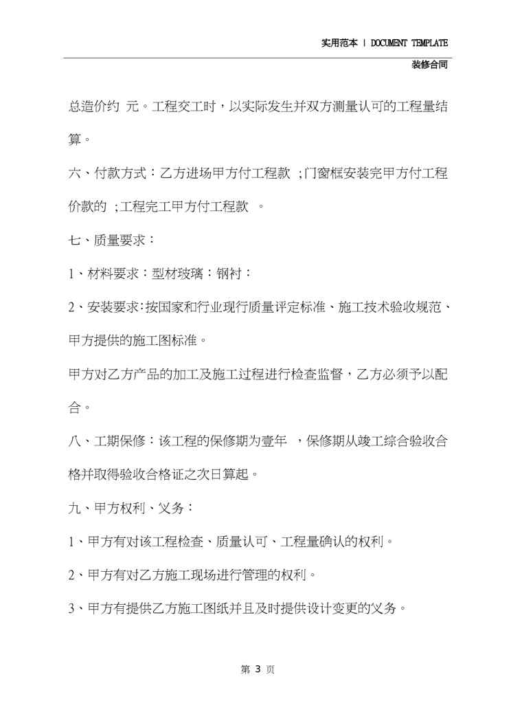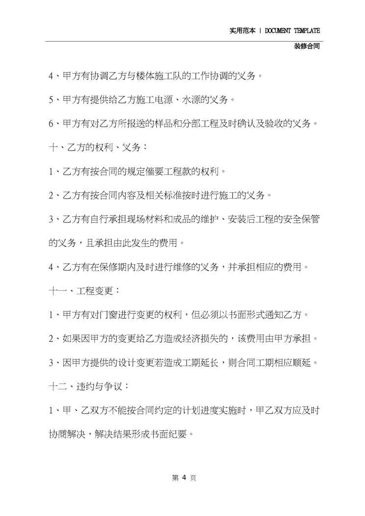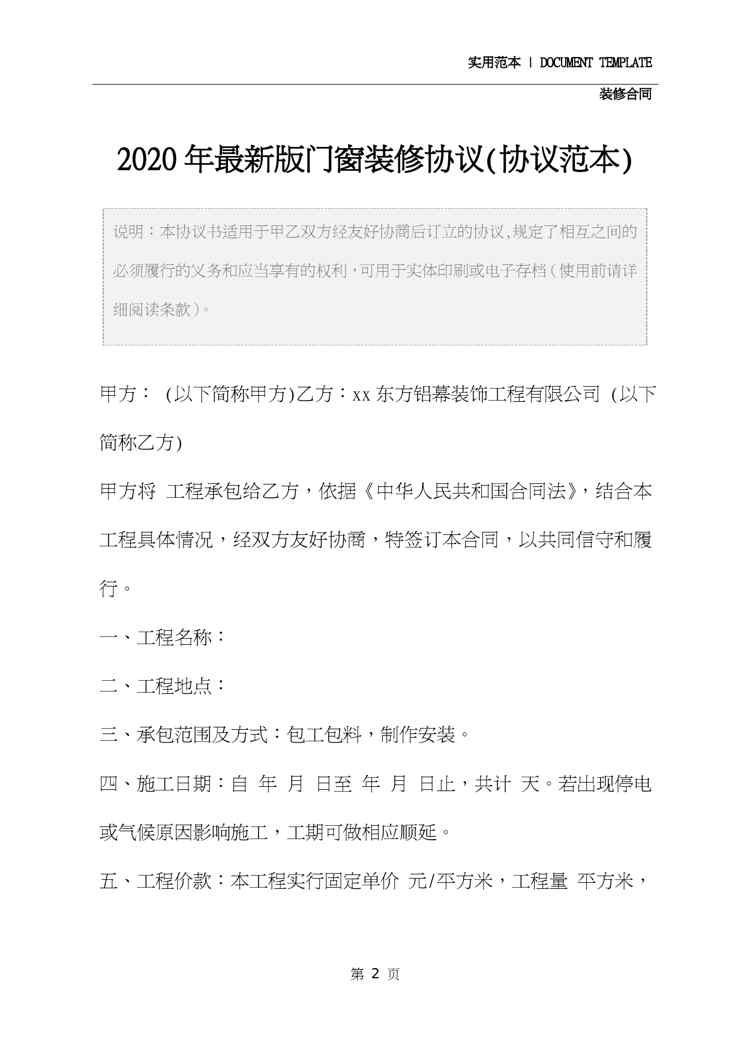 本站资深用户发布了最新的《2020年最新版门窗装修协议(协议范本)》文档,以下内容为预览,详细内容可下载阅读。 声明:本站所有文章,如无特殊说明或标注,均为本站原创发布。任何个人或组织,在未征得本站同意时,禁止复制、盗用、采集、发布本站内容到任何网站、书籍等各类媒体平台。如若本站内容侵犯了原著者的合法权益,可联系我们进行处理。