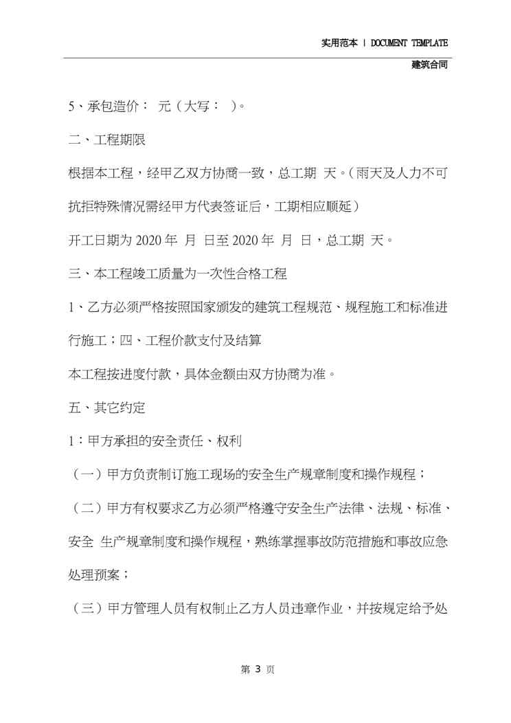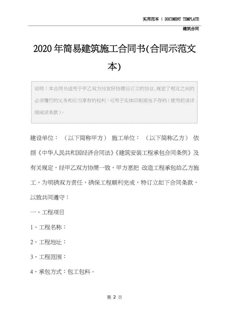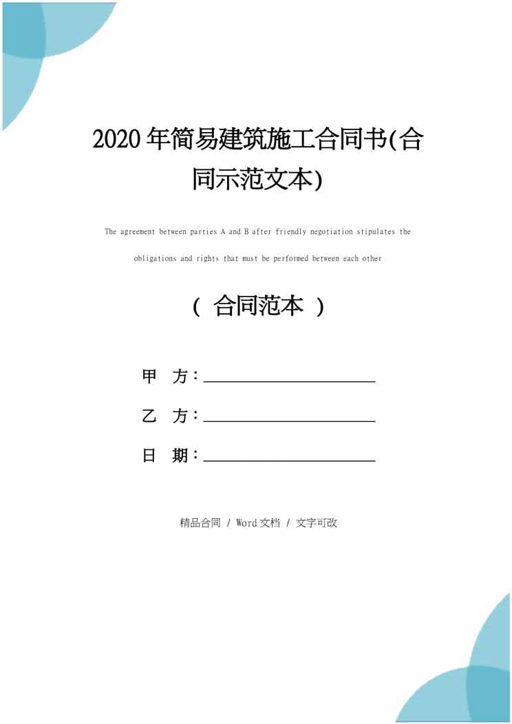 不久前,最新文档《2020年简易建筑施工合同书(合同示范文本)》全文正式在本站发布,感兴趣的用户可以下载阅读。 声明:本站所有文章,如无特殊说明或标注,均为本站原创发布。任何个人或组织,在未征得本站同意时,禁止复制、盗用、采集、发布本站内容到任何网站、书籍等各类媒体平台。如若本站内容侵犯了原著者的合法权益,可联系我们进行处理。