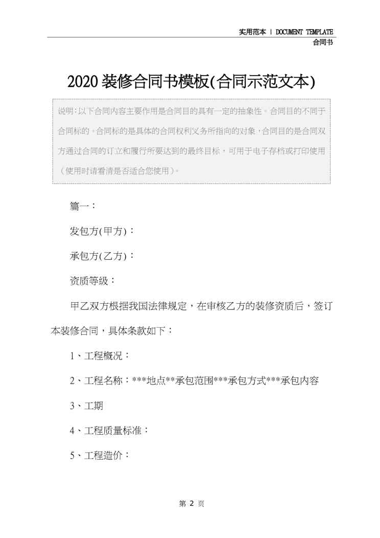 不久前,最新文档《2020装修合同书模板(合同示范文本)》全文正式在本站发布,感兴趣的用户可以下载阅读。 声明:本站所有文章,如无特殊说明或标注,均为本站原创发布。任何个人或组织,在未征得本站同意时,禁止复制、盗用、采集、发布本站内容到任何网站、书籍等各类媒体平台。如若本站内容侵犯了原著者的合法权益,可联系我们进行处理。