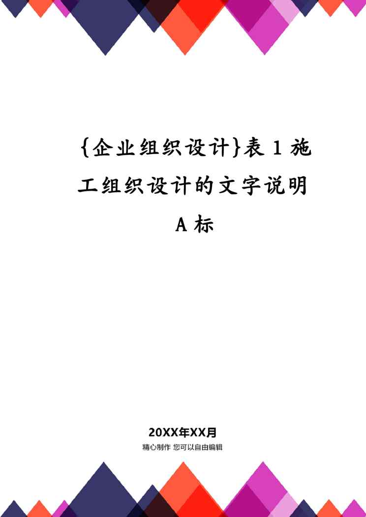 本站资深用户发布了最新的《{企业组织设计}表1施工组织设计的文字说明A标》文档,以下内容为预览,详细内容可下载阅读。 声明:本站所有文章,如无特殊说明或标注,均为本站原创发布。任何个人或组织,在未征得本站同意时,禁止复制、盗用、采集、发布本站内容到任何网站、书籍等各类媒体平台。如若本站内容侵犯了原著者的合法权益,可联系我们进行处理。
