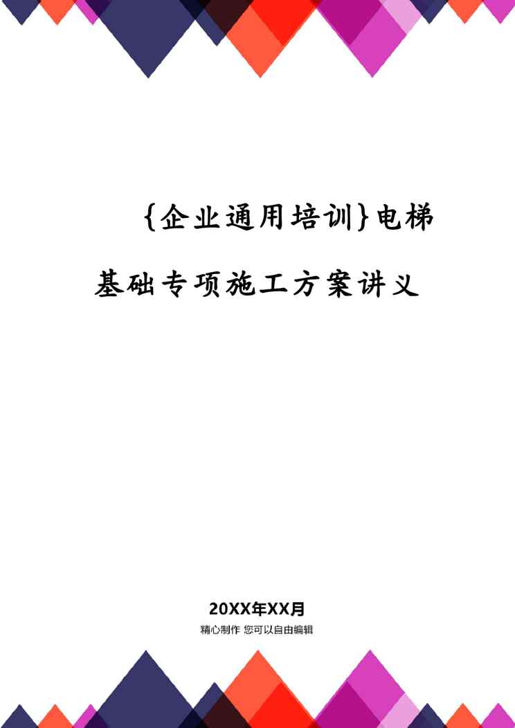 本站资深用户发布了最新的《{企业通用培训}电梯基础专项施工方案讲义》文档,以下内容为预览,详细内容可下载阅读。 声明:本站所有文章,如无特殊说明或标注,均为本站原创发布。任何个人或组织,在未征得本站同意时,禁止复制、盗用、采集、发布本站内容到任何网站、书籍等各类媒体平台。如若本站内容侵犯了原著者的合法权益,可联系我们进行处理。