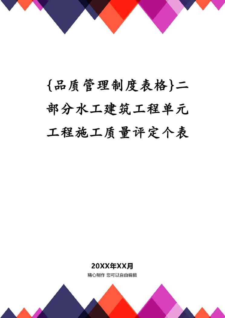 本站正式发布了《{品质管理制度表格}二部分水工建筑工程单元工程施工质量评定个表》文档,文档详细内容可下载阅读。 声明:本站所有文章,如无特殊说明或标注,均为本站原创发布。任何个人或组织,在未征得本站同意时,禁止复制、盗用、采集、发布本站内容到任何网站、书籍等各类媒体平台。如若本站内容侵犯了原著者的合法权益,可联系我们进行处理。