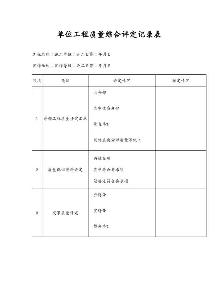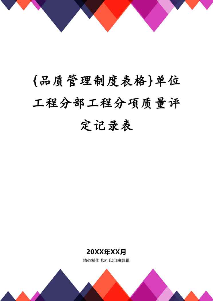 本站正式发布了《{品质管理制度表格}单位工程分部工程分项质量评定记录表》文档,文档详细内容可下载阅读。 声明:本站所有文章,如无特殊说明或标注,均为本站原创发布。任何个人或组织,在未征得本站同意时,禁止复制、盗用、采集、发布本站内容到任何网站、书籍等各类媒体平台。如若本站内容侵犯了原著者的合法权益,可联系我们进行处理。