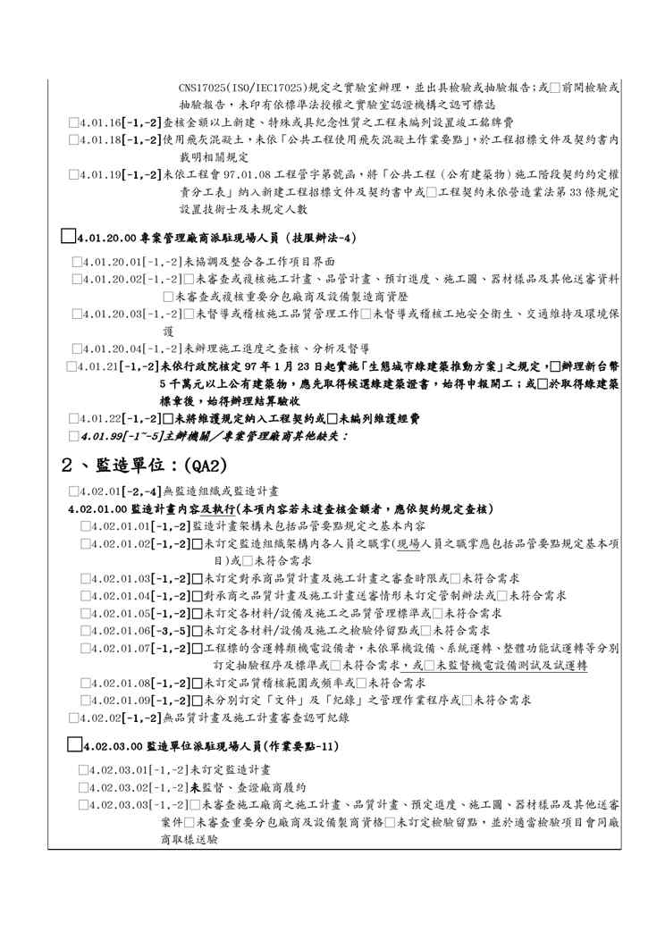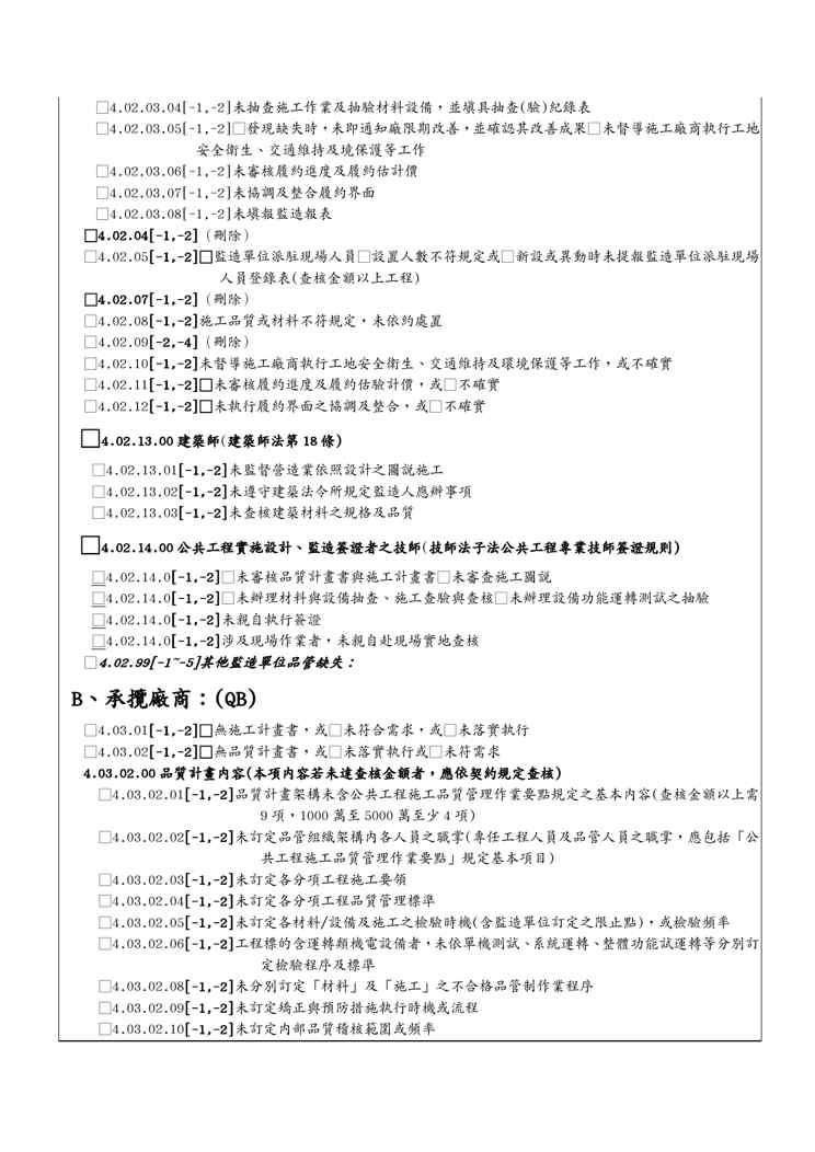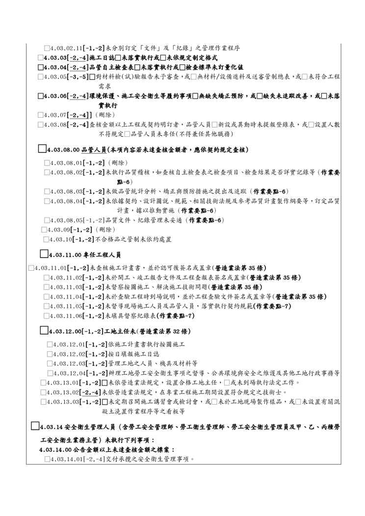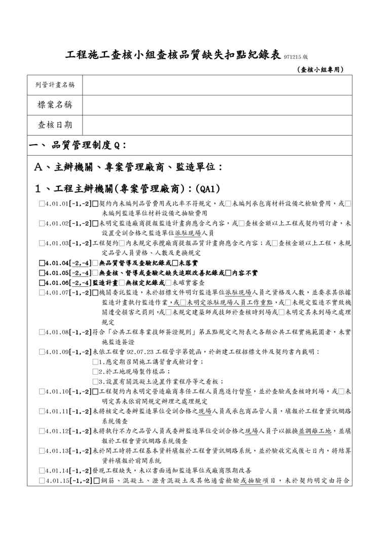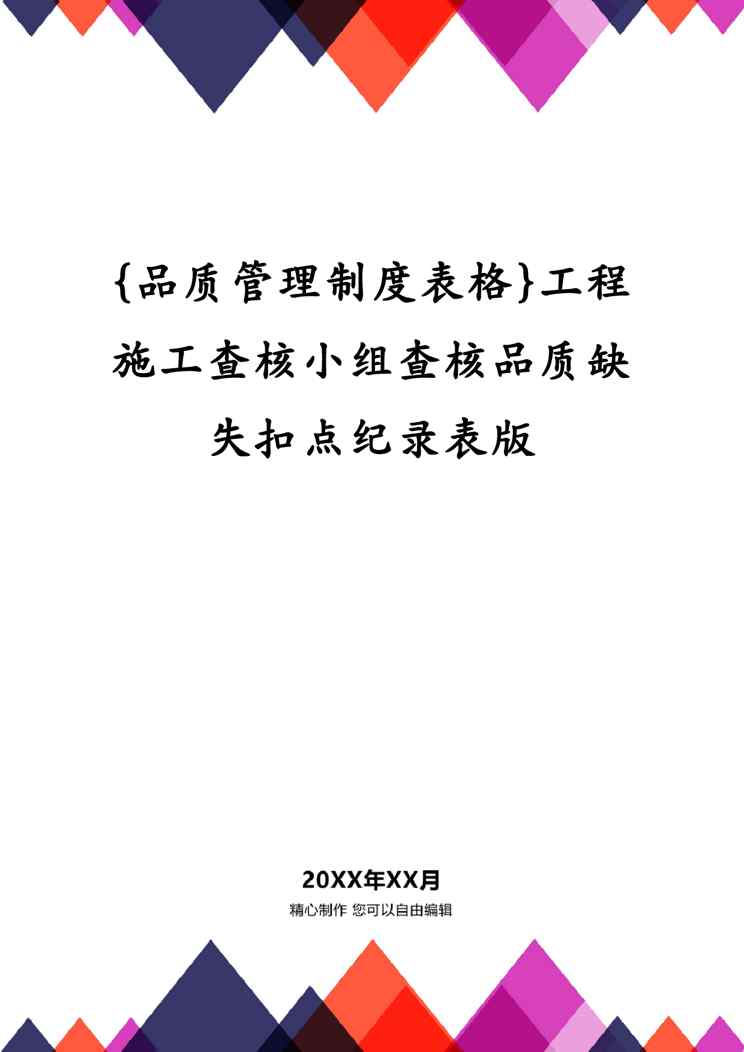 本站正式发布了《{品质管理制度表格}工程施工查核小组查核品质缺失扣点纪录表版》文档,文档详细内容可下载阅读。 声明:本站所有文章,如无特殊说明或标注,均为本站原创发布。任何个人或组织,在未征得本站同意时,禁止复制、盗用、采集、发布本站内容到任何网站、书籍等各类媒体平台。如若本站内容侵犯了原著者的合法权益,可联系我们进行处理。