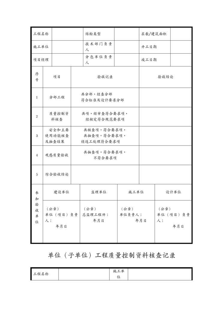 本站资深用户发布了最新的《{品质管理制度表格}建筑工程施工质量验收统标准表格》文档,以下内容为预览,详细内容可下载阅读。 声明:本站所有文章,如无特殊说明或标注,均为本站原创发布。任何个人或组织,在未征得本站同意时,禁止复制、盗用、采集、发布本站内容到任何网站、书籍等各类媒体平台。如若本站内容侵犯了原著者的合法权益,可联系我们进行处理。