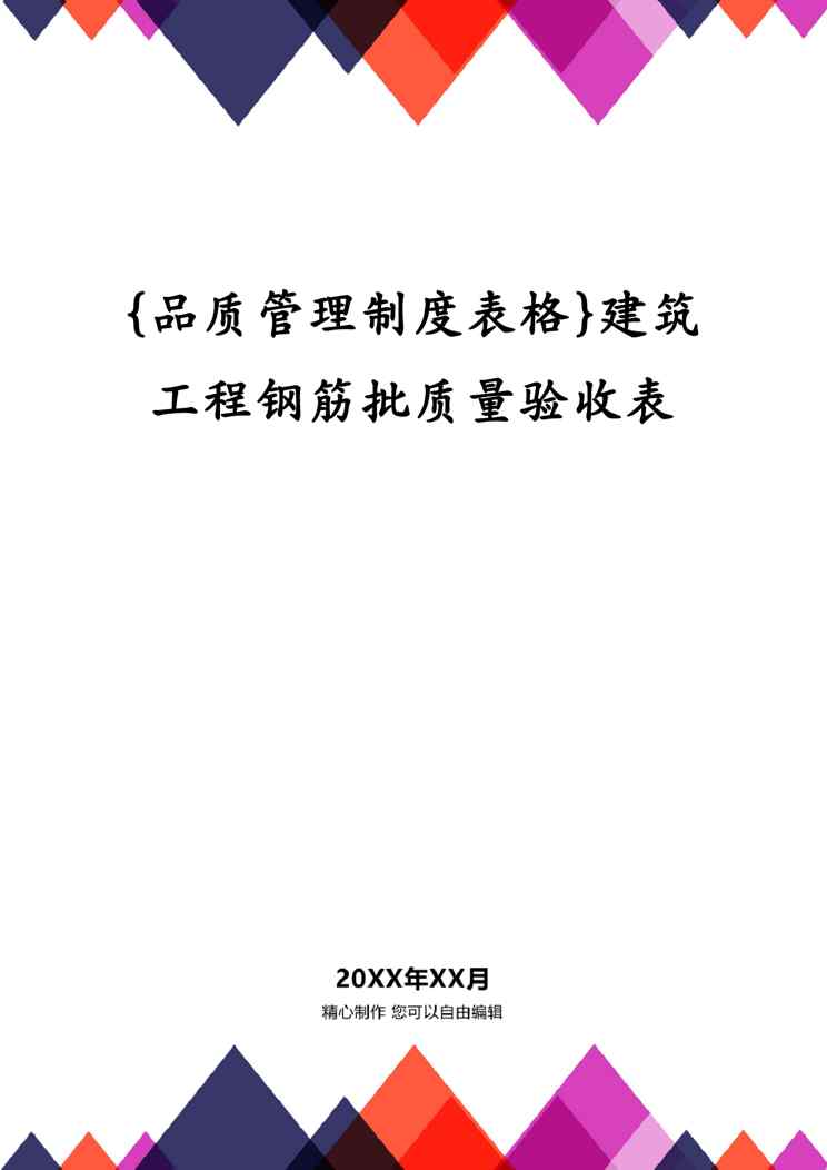 本站正式发布了《{品质管理制度表格}建筑工程钢筋批质量验收表》文档,文档详细内容可下载阅读。 声明:本站所有文章,如无特殊说明或标注,均为本站原创发布。任何个人或组织,在未征得本站同意时,禁止复制、盗用、采集、发布本站内容到任何网站、书籍等各类媒体平台。如若本站内容侵犯了原著者的合法权益,可联系我们进行处理。