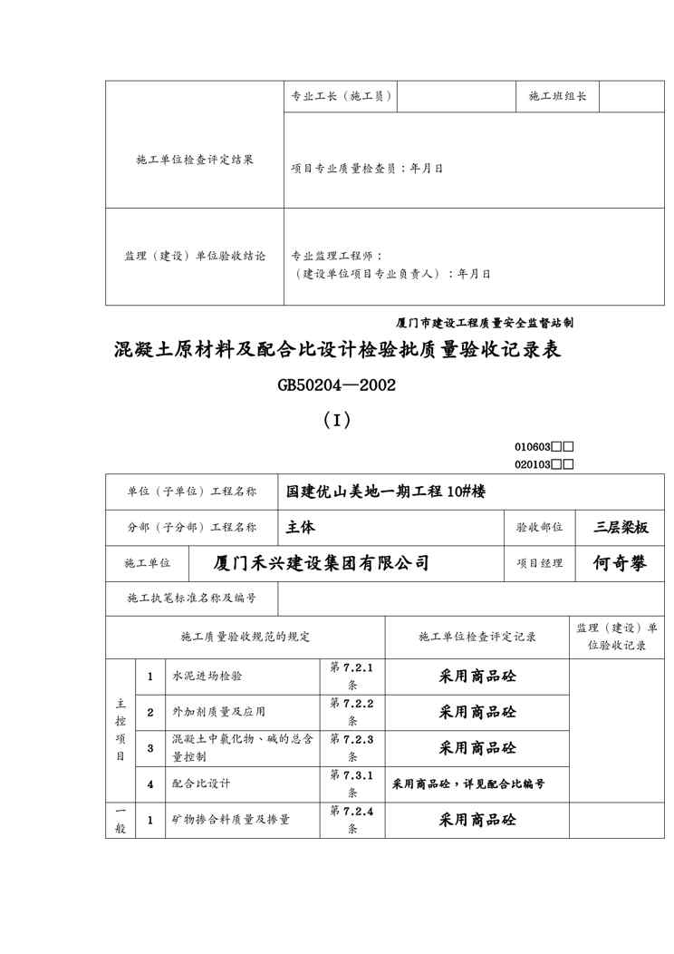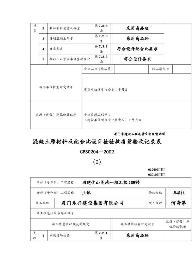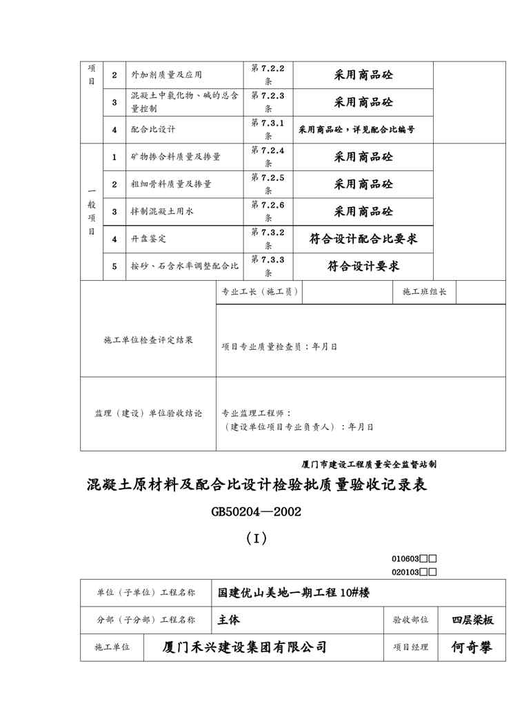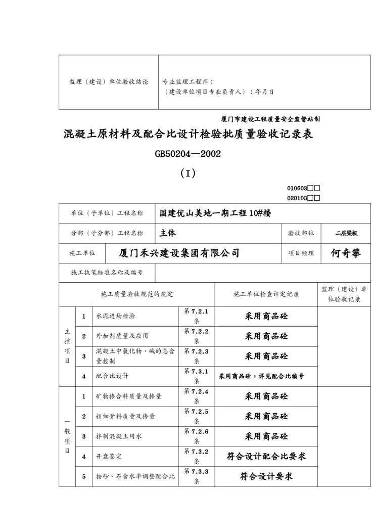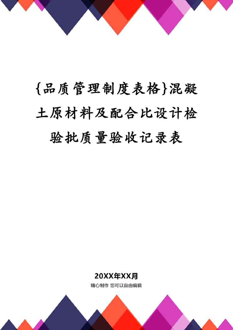 本站资深用户发布了最新的《{品质管理制度表格}混凝土原材料及配合比设计检验批质量验收记录表》文档,以下内容为预览,详细内容可下载阅读。 声明:本站所有文章,如无特殊说明或标注,均为本站原创发布。任何个人或组织,在未征得本站同意时,禁止复制、盗用、采集、发布本站内容到任何网站、书籍等各类媒体平台。如若本站内容侵犯了原著者的合法权益,可联系我们进行处理。
