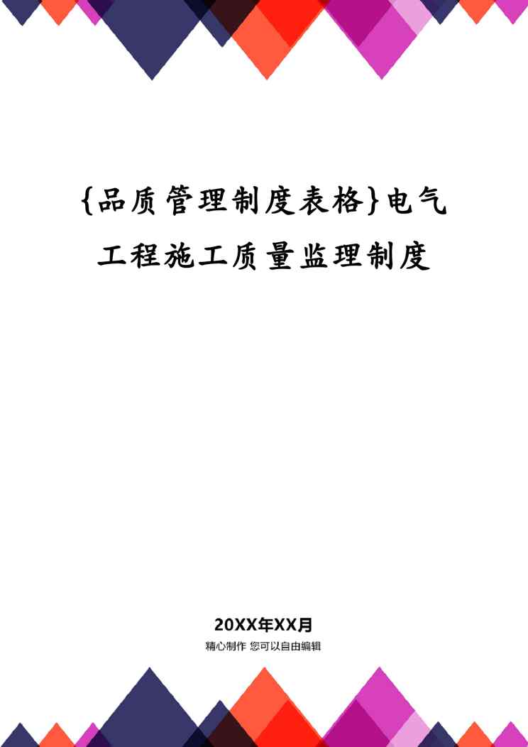 本站资深用户发布了最新的《{品质管理制度表格}电气工程施工质量监理制度》文档,以下内容为预览,详细内容可下载阅读。 声明:本站所有文章,如无特殊说明或标注,均为本站原创发布。任何个人或组织,在未征得本站同意时,禁止复制、盗用、采集、发布本站内容到任何网站、书籍等各类媒体平台。如若本站内容侵犯了原著者的合法权益,可联系我们进行处理。