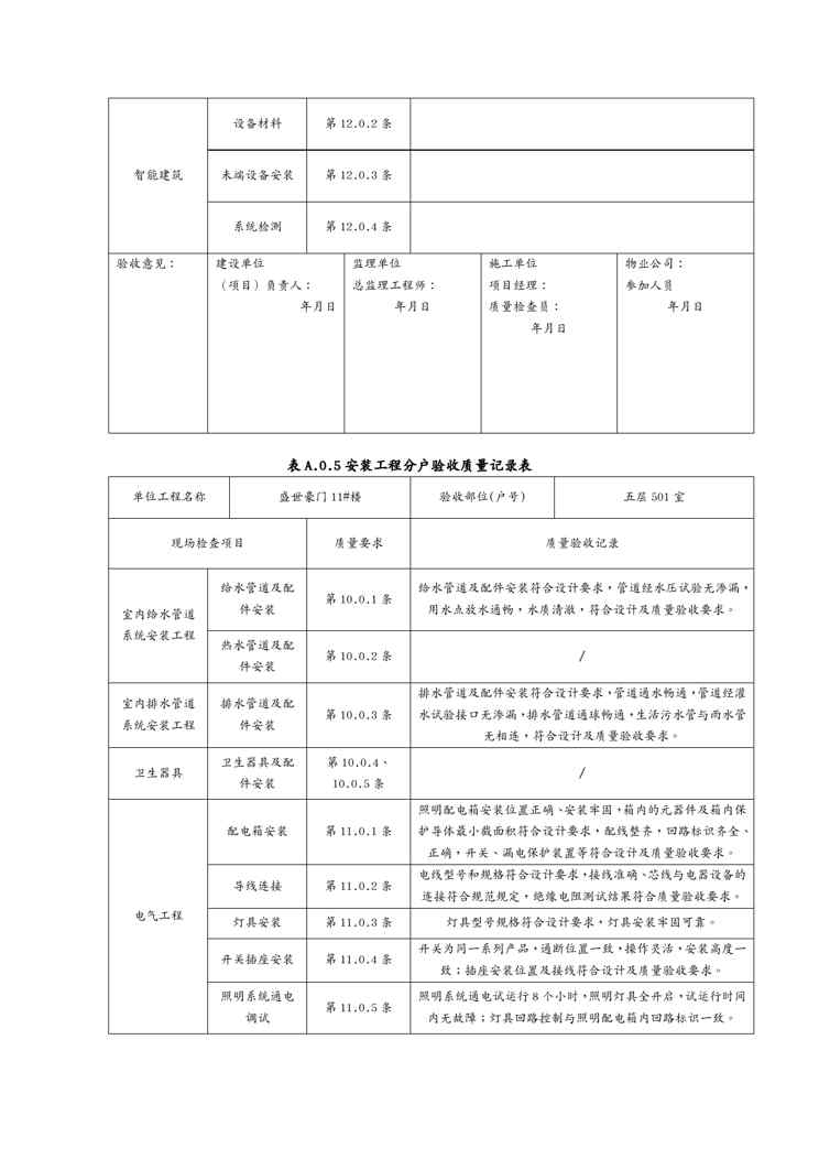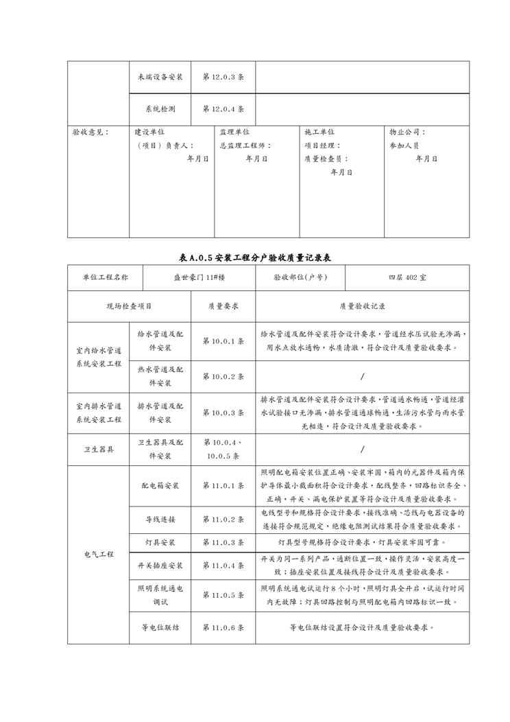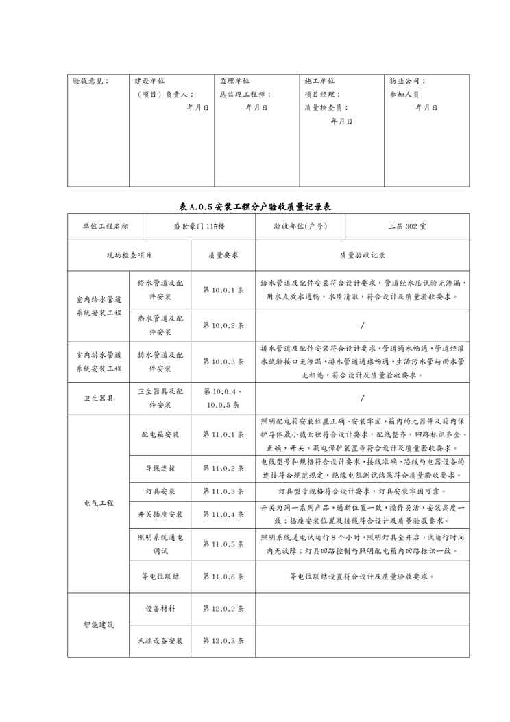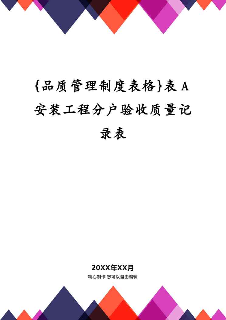 本站正式发布了《{品质管理制度表格}表A安装工程分户验收质量记录表》文档,文档详细内容可下载阅读。 声明:本站所有文章,如无特殊说明或标注,均为本站原创发布。任何个人或组织,在未征得本站同意时,禁止复制、盗用、采集、发布本站内容到任何网站、书籍等各类媒体平台。如若本站内容侵犯了原著者的合法权益,可联系我们进行处理。