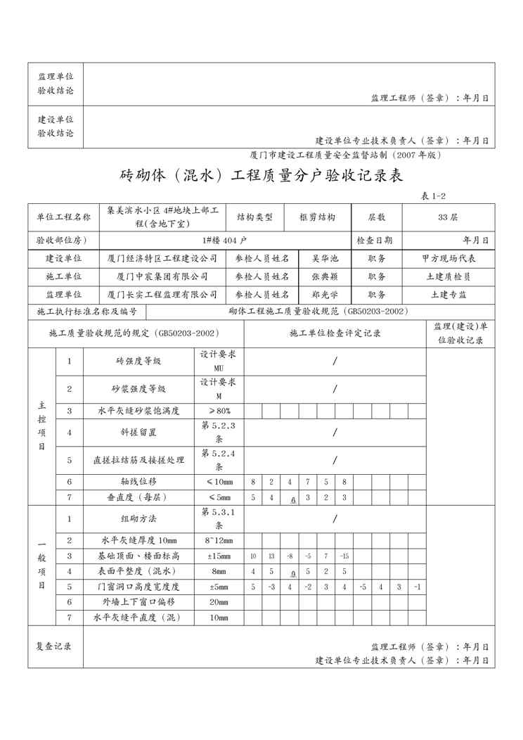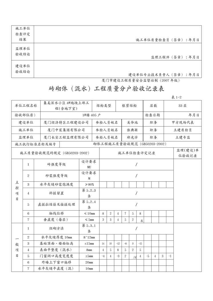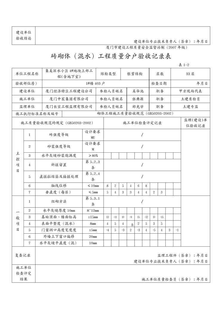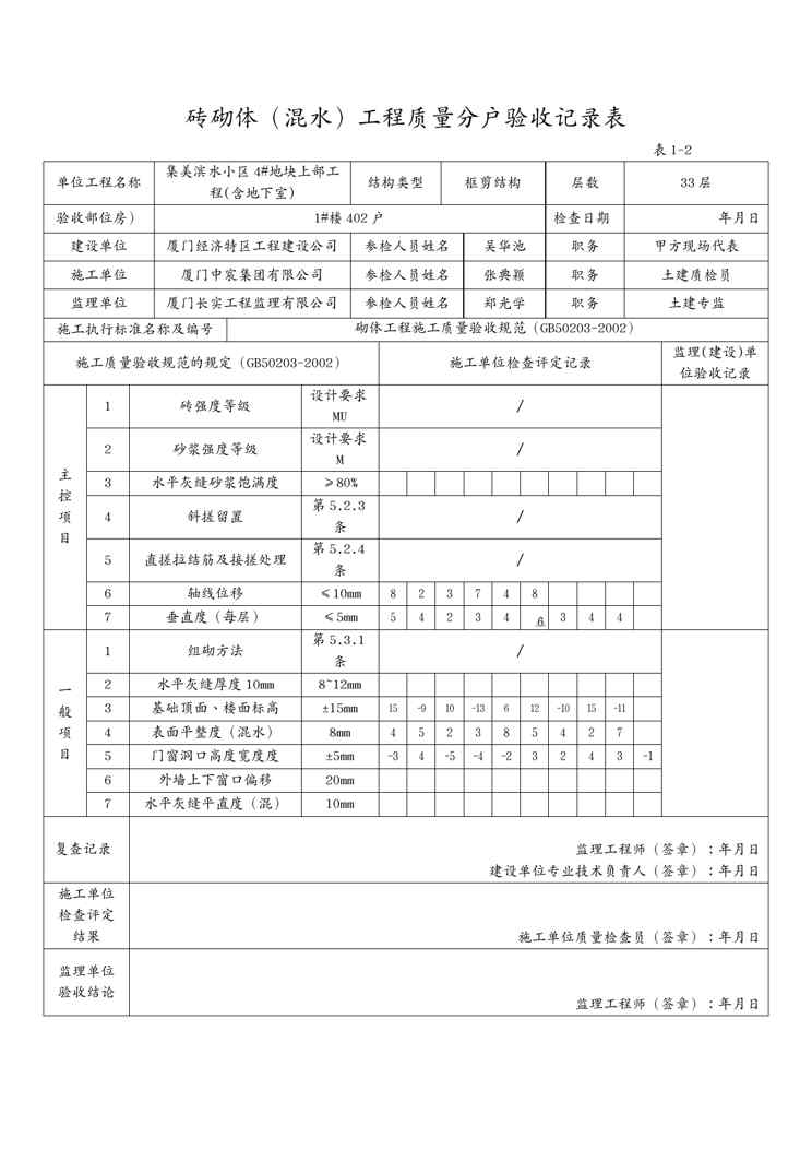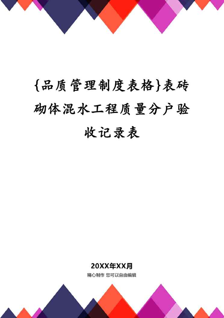 本站资深用户发布了最新的《{品质管理制度表格}表砖砌体混水工程质量分户验收记录表》文档,以下内容为预览,详细内容可下载阅读。 声明:本站所有文章,如无特殊说明或标注,均为本站原创发布。任何个人或组织,在未征得本站同意时,禁止复制、盗用、采集、发布本站内容到任何网站、书籍等各类媒体平台。如若本站内容侵犯了原著者的合法权益,可联系我们进行处理。