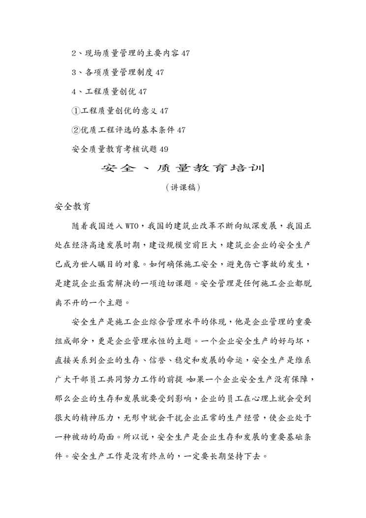 本站正式发布了《{品质管理品质培训}建筑业安全质量教育培训讲义》文档,文档详细内容可下载阅读。 声明:本站所有文章,如无特殊说明或标注,均为本站原创发布。任何个人或组织,在未征得本站同意时,禁止复制、盗用、采集、发布本站内容到任何网站、书籍等各类媒体平台。如若本站内容侵犯了原著者的合法权益,可联系我们进行处理。