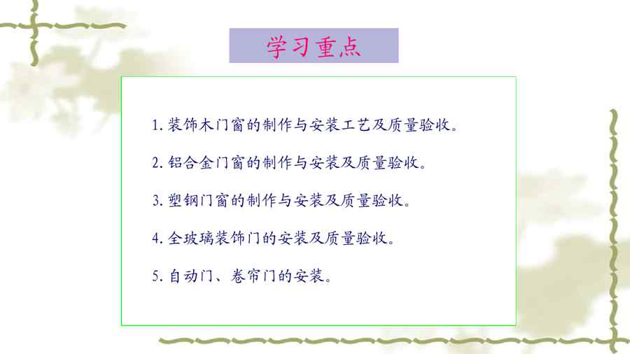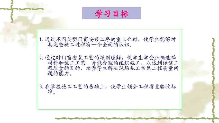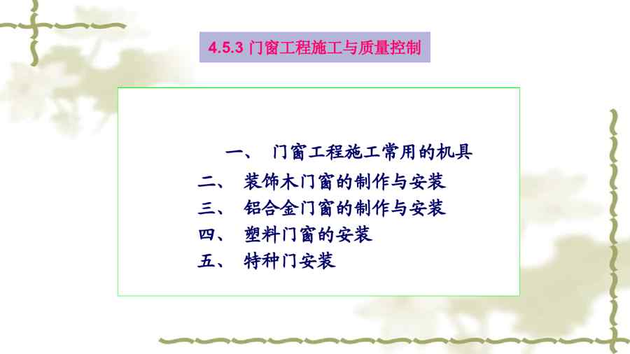 本站资深用户发布了最新的《{品质管理品质培训}门窗工程施工与质量控制讲义》文档,以下内容为预览,详细内容可下载阅读。 声明:本站所有文章,如无特殊说明或标注,均为本站原创发布。任何个人或组织,在未征得本站同意时,禁止复制、盗用、采集、发布本站内容到任何网站、书籍等各类媒体平台。如若本站内容侵犯了原著者的合法权益,可联系我们进行处理。