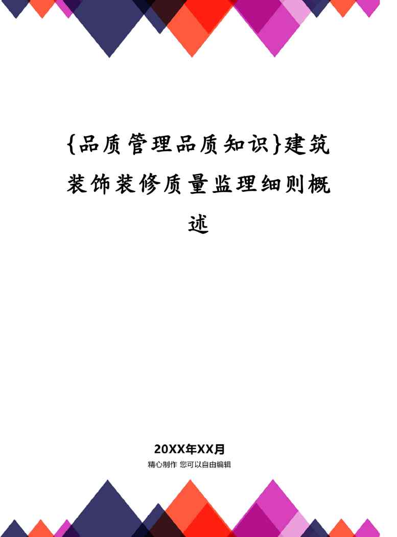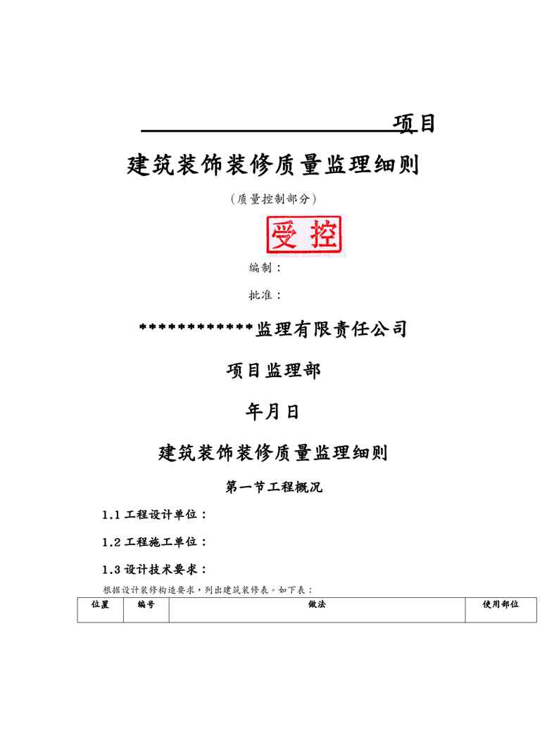 本站资深用户发布了最新的《{品质管理品质知识}建筑装饰装修质量监理细则概述》文档,以下内容为预览,详细内容可下载阅读。 声明:本站所有文章,如无特殊说明或标注,均为本站原创发布。任何个人或组织,在未征得本站同意时,禁止复制、盗用、采集、发布本站内容到任何网站、书籍等各类媒体平台。如若本站内容侵犯了原著者的合法权益,可联系我们进行处理。
