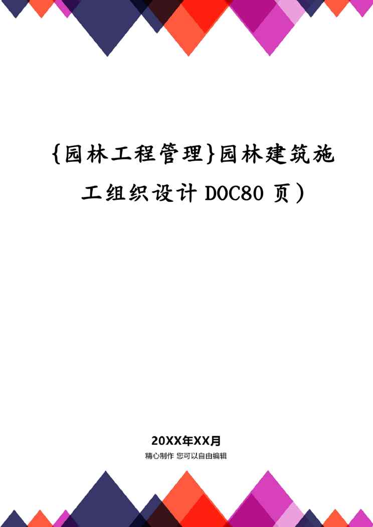不久前,最新文档《{园林工程管理}园林建筑施工组织设计DOC80页)》全文正式在本站发布,感兴趣的用户可以下载阅读。 声明:本站所有文章,如无特殊说明或标注,均为本站原创发布。任何个人或组织,在未征得本站同意时,禁止复制、盗用、采集、发布本站内容到任何网站、书籍等各类媒体平台。如若本站内容侵犯了原著者的合法权益,可联系我们进行处理。