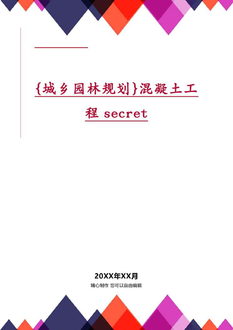 本站资深用户发布了最新的《{城乡园林规划}混凝土工程secret》文档,以下内容为预览,详细内容可下载阅读。 声明:本站所有文章,如无特殊说明或标注,均为本站原创发布。任何个人或组织,在未征得本站同意时,禁止复制、盗用、采集、发布本站内容到任何网站、书籍等各类媒体平台。如若本站内容侵犯了原著者的合法权益,可联系我们进行处理。