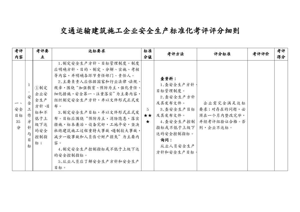 本站资深用户发布了最新的《{安全生产管理}交通运输建筑施工企业安全生产标准化考评评分细则》文档,以下内容为预览,详细内容可下载阅读。 声明:本站所有文章,如无特殊说明或标注,均为本站原创发布。任何个人或组织,在未征得本站同意时,禁止复制、盗用、采集、发布本站内容到任何网站、书籍等各类媒体平台。如若本站内容侵犯了原著者的合法权益,可联系我们进行处理。