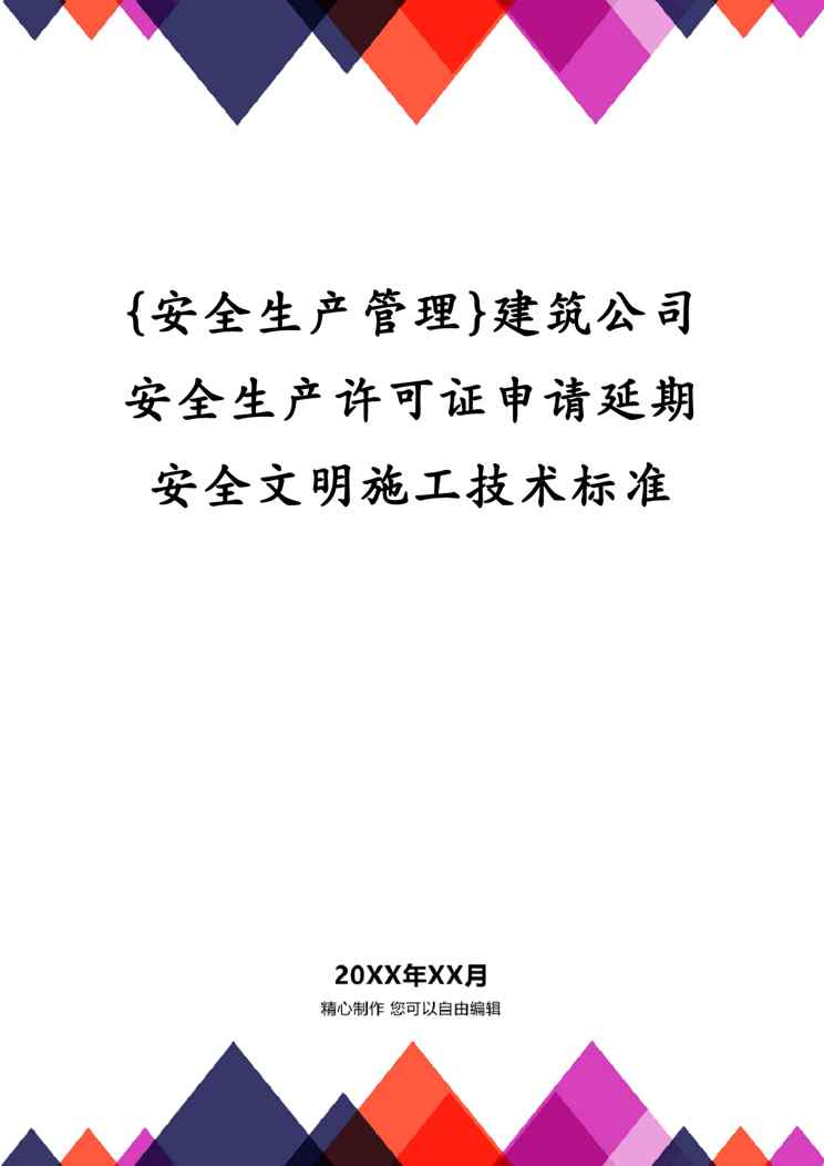本站正式发布了《{安全生产管理}建筑公司安全生产许可证申请延期安全文明施工技术标准》文档,文档详细内容可下载阅读。 声明:本站所有文章,如无特殊说明或标注,均为本站原创发布。任何个人或组织,在未征得本站同意时,禁止复制、盗用、采集、发布本站内容到任何网站、书籍等各类媒体平台。如若本站内容侵犯了原著者的合法权益,可联系我们进行处理。