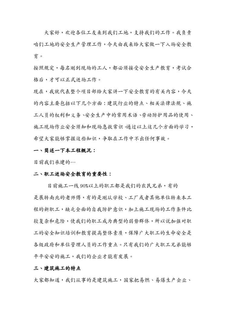 不久前,最新文档《{安全生产管理}建筑施工入场安全教育范本》全文正式在本站发布,感兴趣的用户可以下载阅读。 声明:本站所有文章,如无特殊说明或标注,均为本站原创发布。任何个人或组织,在未征得本站同意时,禁止复制、盗用、采集、发布本站内容到任何网站、书籍等各类媒体平台。如若本站内容侵犯了原著者的合法权益,可联系我们进行处理。