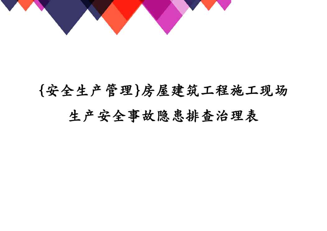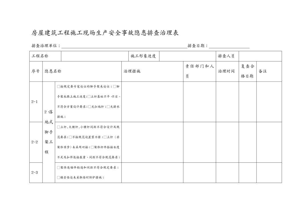 本站资深用户发布了最新的《{安全生产管理}房屋建筑工程施工现场生产安全事故隐患排查治理表》文档,以下内容为预览,详细内容可下载阅读。 声明:本站所有文章,如无特殊说明或标注,均为本站原创发布。任何个人或组织,在未征得本站同意时,禁止复制、盗用、采集、发布本站内容到任何网站、书籍等各类媒体平台。如若本站内容侵犯了原著者的合法权益,可联系我们进行处理。
