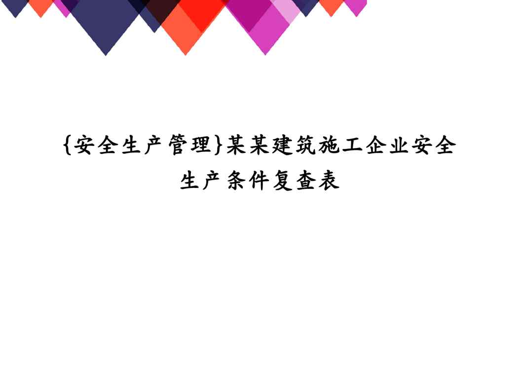 本站正式发布了《{安全生产管理}某某建筑施工企业安全生产条件复查表》文档,文档详细内容可下载阅读。 声明:本站所有文章,如无特殊说明或标注,均为本站原创发布。任何个人或组织,在未征得本站同意时,禁止复制、盗用、采集、发布本站内容到任何网站、书籍等各类媒体平台。如若本站内容侵犯了原著者的合法权益,可联系我们进行处理。