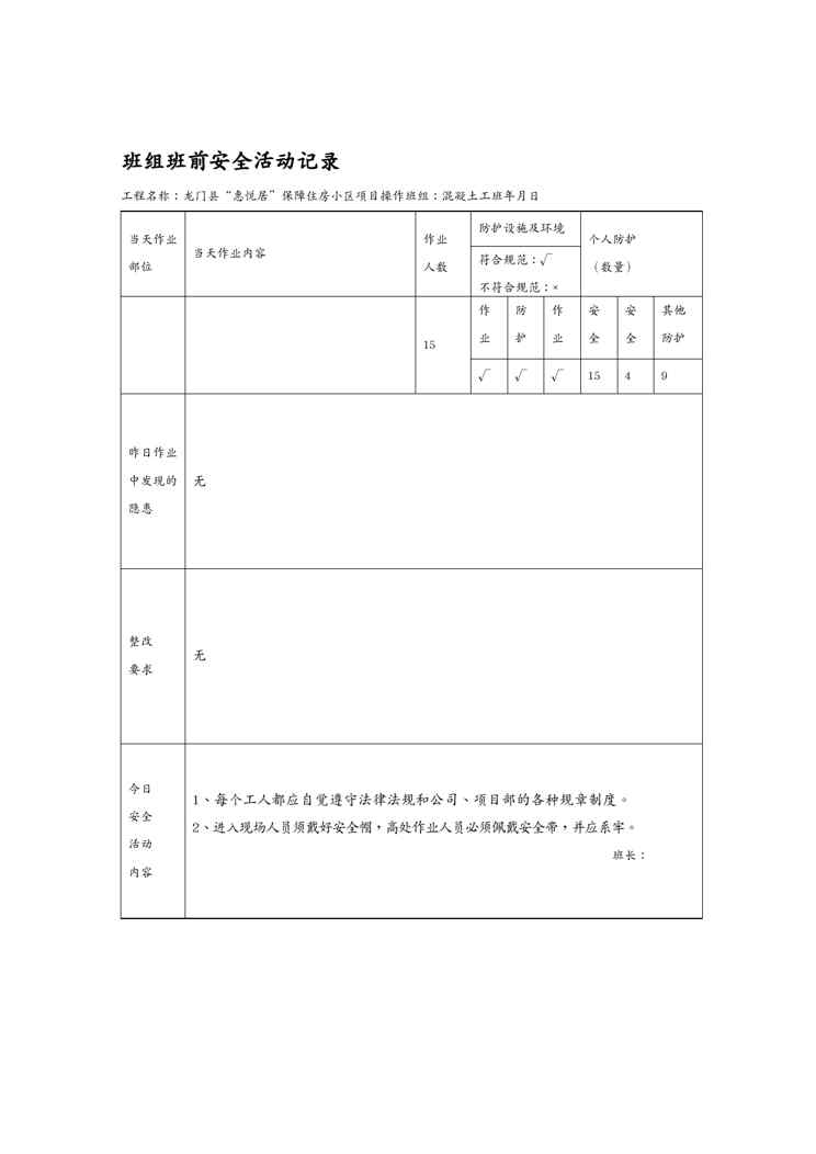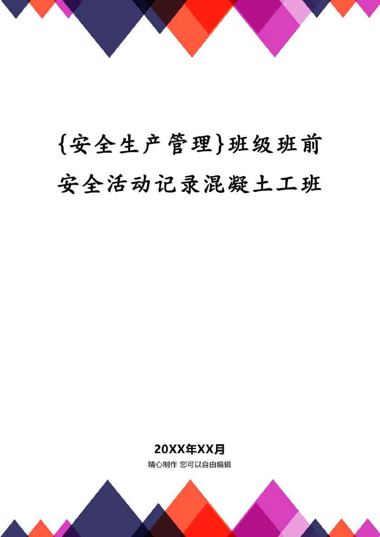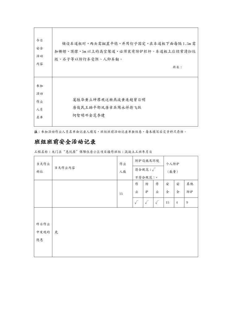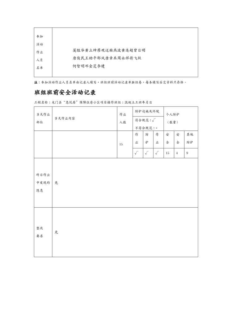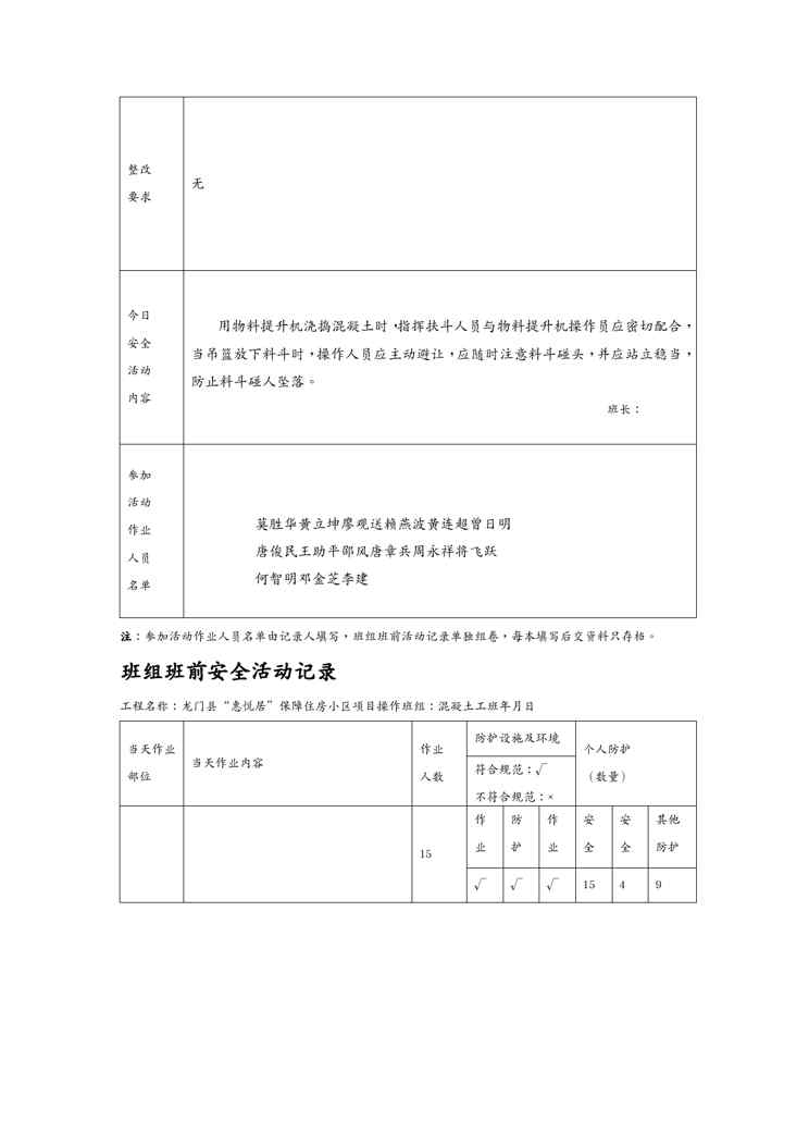 本站资深用户发布了最新的《{安全生产管理}班级班前安全活动记录混凝土工班》文档,以下内容为预览,详细内容可下载阅读。 声明:本站所有文章,如无特殊说明或标注,均为本站原创发布。任何个人或组织,在未征得本站同意时,禁止复制、盗用、采集、发布本站内容到任何网站、书籍等各类媒体平台。如若本站内容侵犯了原著者的合法权益,可联系我们进行处理。