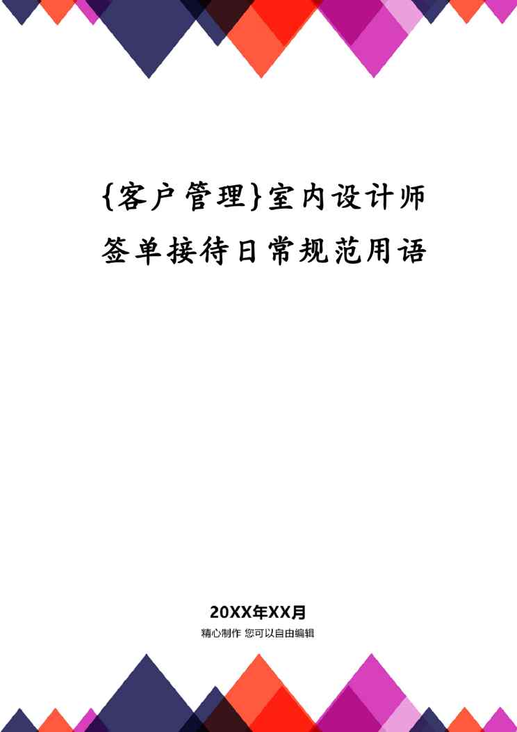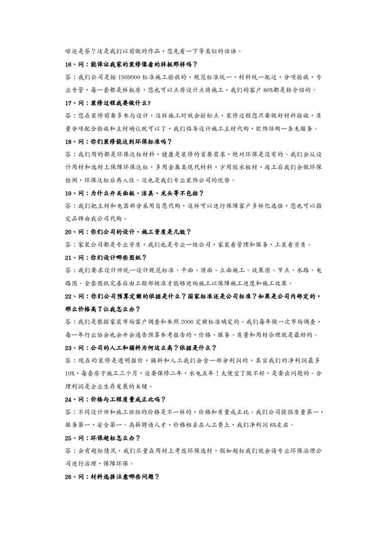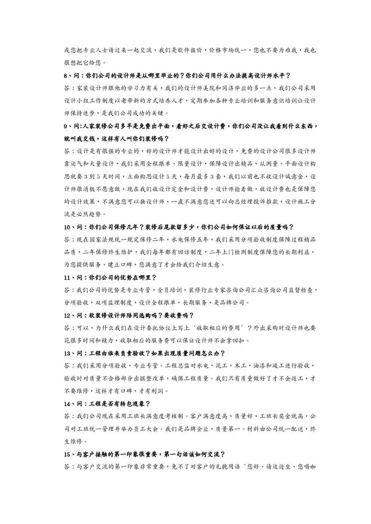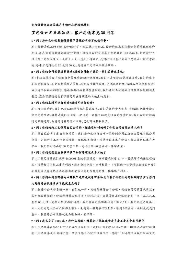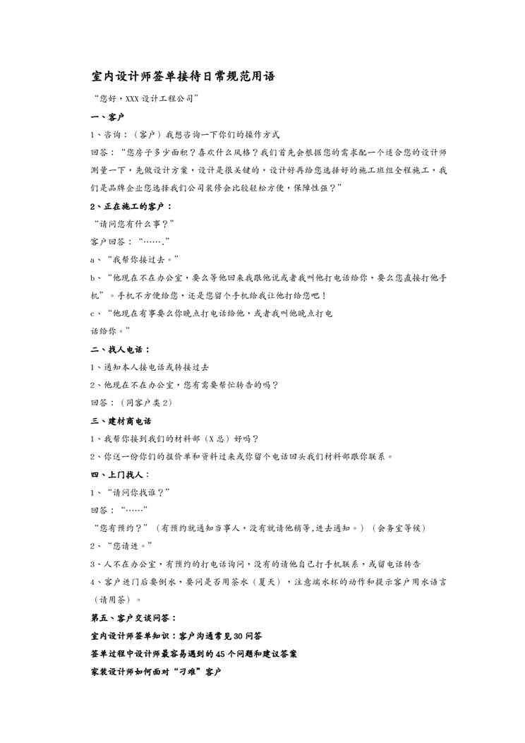 本站资深用户发布了最新的《{客户管理}室内设计师签单接待日常规范用语》文档,以下内容为预览,详细内容可下载阅读。 声明:本站所有文章,如无特殊说明或标注,均为本站原创发布。任何个人或组织,在未征得本站同意时,禁止复制、盗用、采集、发布本站内容到任何网站、书籍等各类媒体平台。如若本站内容侵犯了原著者的合法权益,可联系我们进行处理。