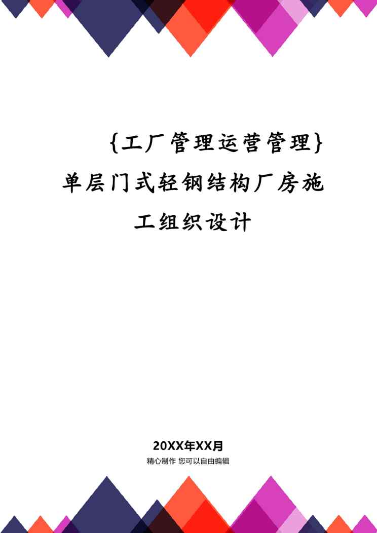 本站正式发布了《{工厂管理运营管理}单层门式轻钢结构厂房施工组织设计》文档,文档详细内容可下载阅读。 声明:本站所有文章,如无特殊说明或标注,均为本站原创发布。任何个人或组织,在未征得本站同意时,禁止复制、盗用、采集、发布本站内容到任何网站、书籍等各类媒体平台。如若本站内容侵犯了原著者的合法权益,可联系我们进行处理。