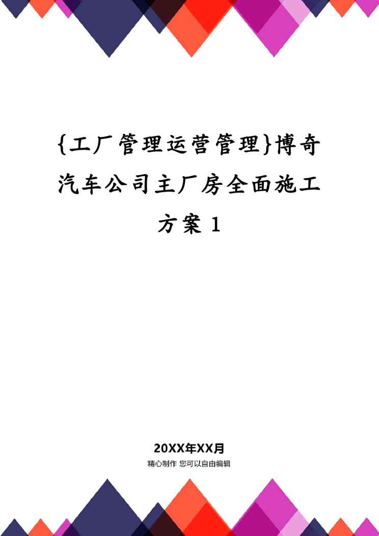 本站资深用户发布了最新的《{工厂管理运营管理}博奇汽车公司主厂房全面施工方案1》文档,以下内容为预览,详细内容可下载阅读。 声明:本站所有文章,如无特殊说明或标注,均为本站原创发布。任何个人或组织,在未征得本站同意时,禁止复制、盗用、采集、发布本站内容到任何网站、书籍等各类媒体平台。如若本站内容侵犯了原著者的合法权益,可联系我们进行处理。