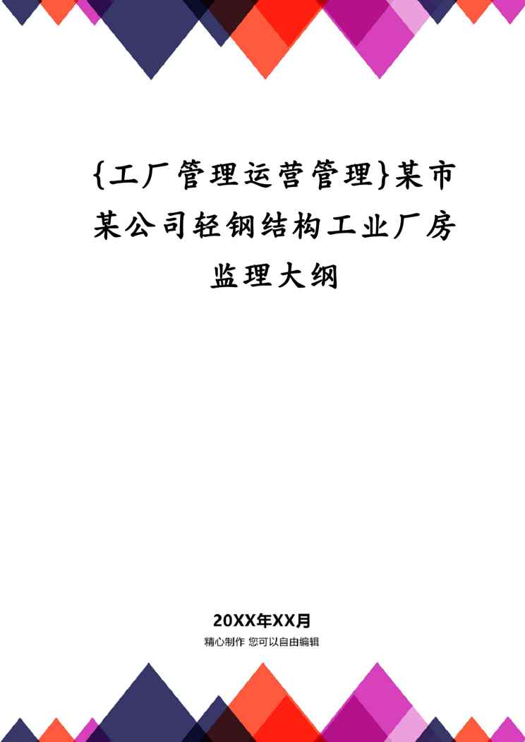 本站正式发布了《{工厂管理运营管理}某市某公司轻钢结构工业厂房监理大纲》文档,文档详细内容可下载阅读。 声明:本站所有文章,如无特殊说明或标注,均为本站原创发布。任何个人或组织,在未征得本站同意时,禁止复制、盗用、采集、发布本站内容到任何网站、书籍等各类媒体平台。如若本站内容侵犯了原著者的合法权益,可联系我们进行处理。