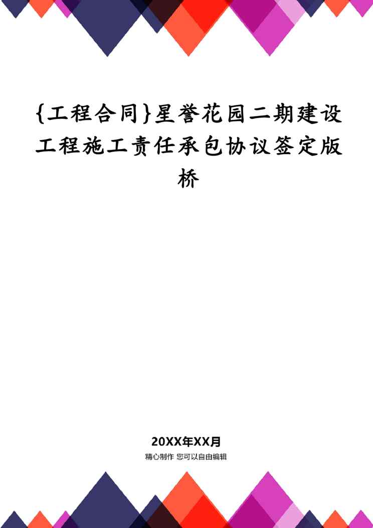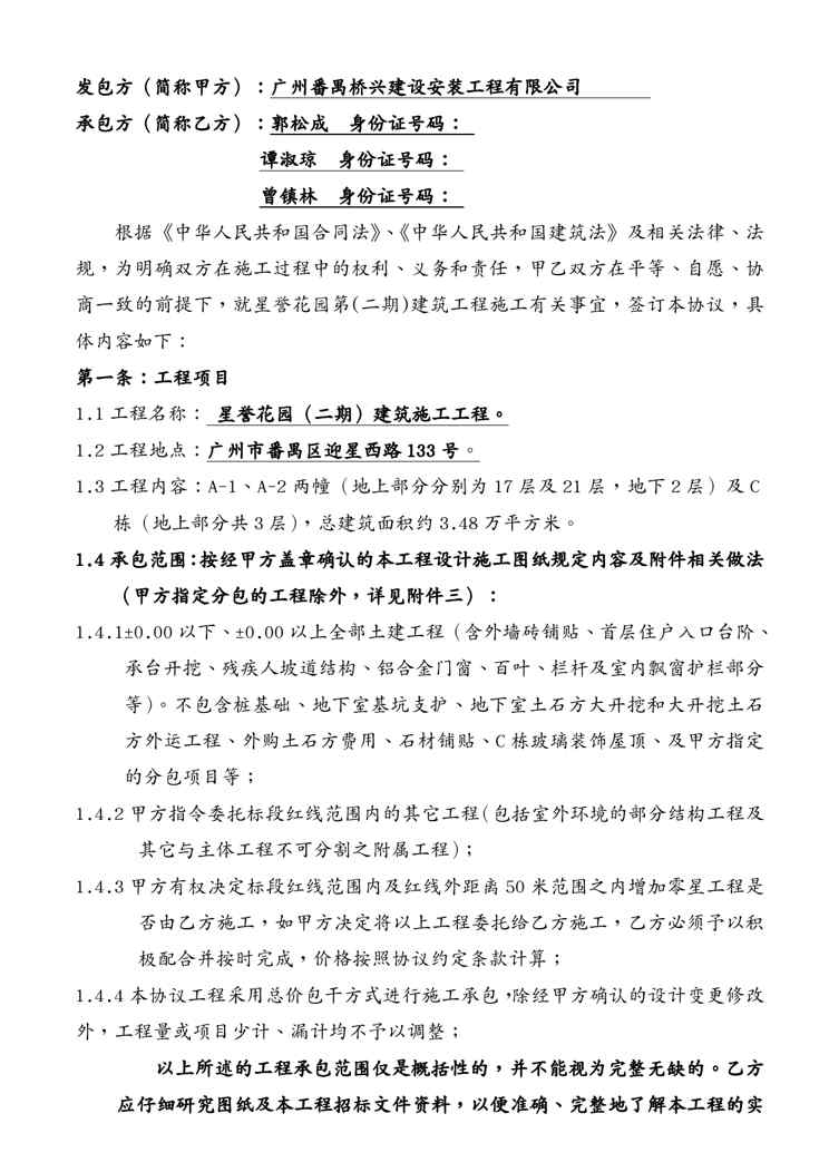 本站正式发布了《{工程合同}星誉花园二期建设工程施工责任承包协议签定版桥》文档,文档详细内容可下载阅读。 声明:本站所有文章,如无特殊说明或标注,均为本站原创发布。任何个人或组织,在未征得本站同意时,禁止复制、盗用、采集、发布本站内容到任何网站、书籍等各类媒体平台。如若本站内容侵犯了原著者的合法权益,可联系我们进行处理。