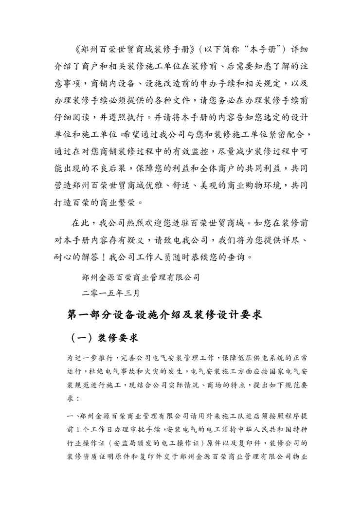 本站资深用户发布了最新的《{店铺管理}郑州百荣世贸商城商铺装修手册》文档,以下内容为预览,详细内容可下载阅读。 声明:本站所有文章,如无特殊说明或标注,均为本站原创发布。任何个人或组织,在未征得本站同意时,禁止复制、盗用、采集、发布本站内容到任何网站、书籍等各类媒体平台。如若本站内容侵犯了原著者的合法权益,可联系我们进行处理。