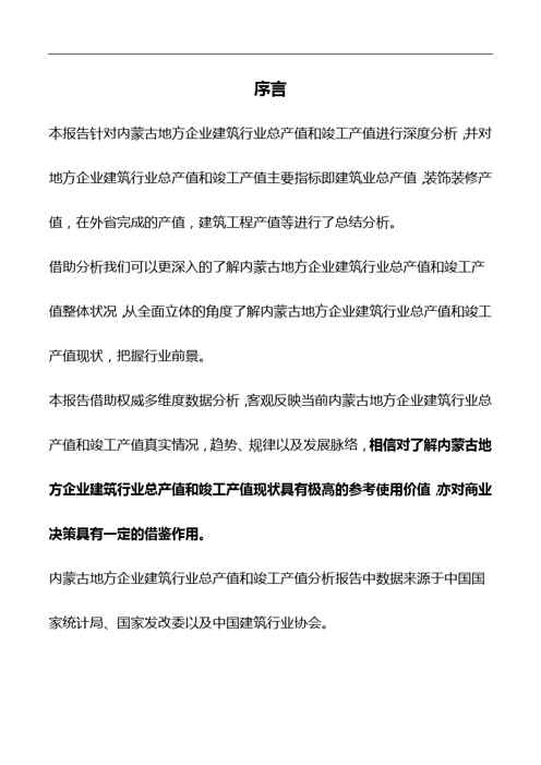 本站资深用户发布了最新的《2018版内蒙古地方企业建筑行业总产值和竣工产值分析报告》文档,以下内容为预览,详细内容可下载阅读。 声明:本站所有文章,如无特殊说明或标注,均为本站原创发布。任何个人或组织,在未征得本站同意时,禁止复制、盗用、采集、发布本站内容到任何网站、书籍等各类媒体平台。如若本站内容侵犯了原著者的合法权益,可联系我们进行处理。