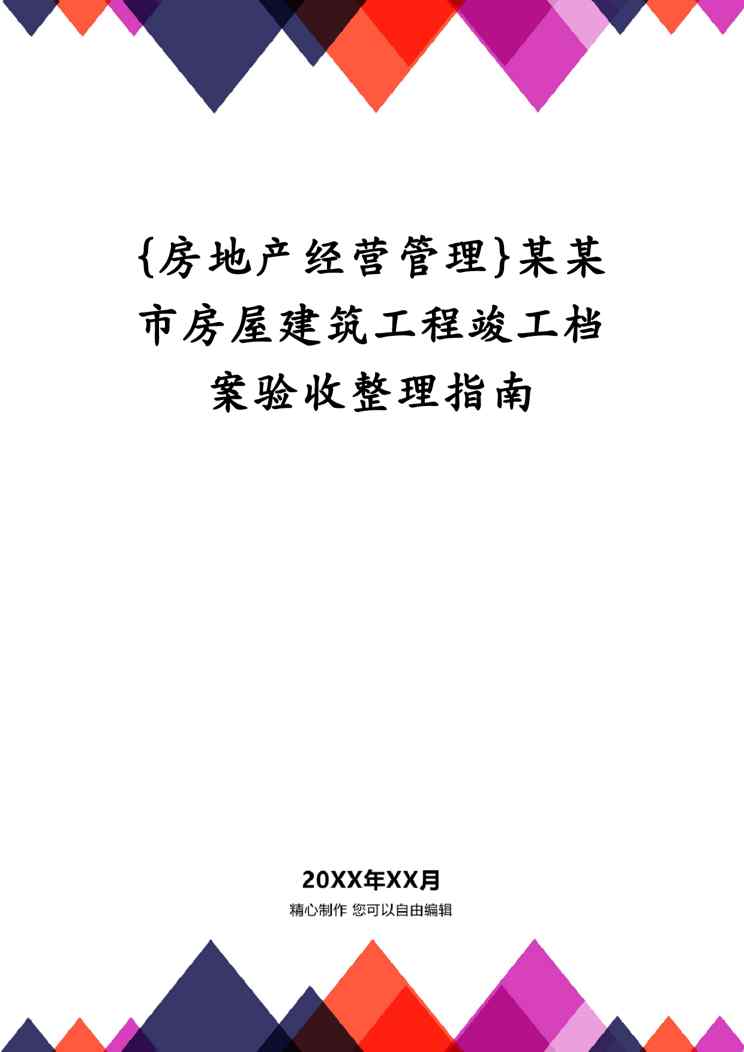 不久前,最新文档《{房地产经营管理}某某市房屋建筑工程竣工档案验收整理指南》全文正式在本站发布,感兴趣的用户可以下载阅读。 声明:本站所有文章,如无特殊说明或标注,均为本站原创发布。任何个人或组织,在未征得本站同意时,禁止复制、盗用、采集、发布本站内容到任何网站、书籍等各类媒体平台。如若本站内容侵犯了原著者的合法权益,可联系我们进行处理。