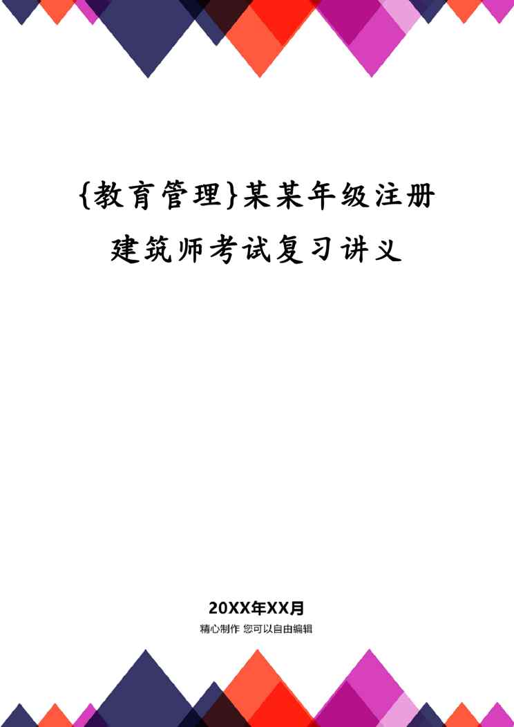 本站资深用户发布了最新的《{教育管理}某某年级注册建筑师考试复习讲义》文档,以下内容为预览,详细内容可下载阅读。 声明:本站所有文章,如无特殊说明或标注,均为本站原创发布。任何个人或组织,在未征得本站同意时,禁止复制、盗用、采集、发布本站内容到任何网站、书籍等各类媒体平台。如若本站内容侵犯了原著者的合法权益,可联系我们进行处理。