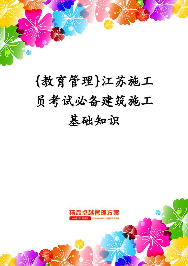 本站正式发布了《{教育管理}江苏施工员考试必备建筑施工基础知识》文档,文档详细内容可下载阅读。 声明:本站所有文章,如无特殊说明或标注,均为本站原创发布。任何个人或组织,在未征得本站同意时,禁止复制、盗用、采集、发布本站内容到任何网站、书籍等各类媒体平台。如若本站内容侵犯了原著者的合法权益,可联系我们进行处理。