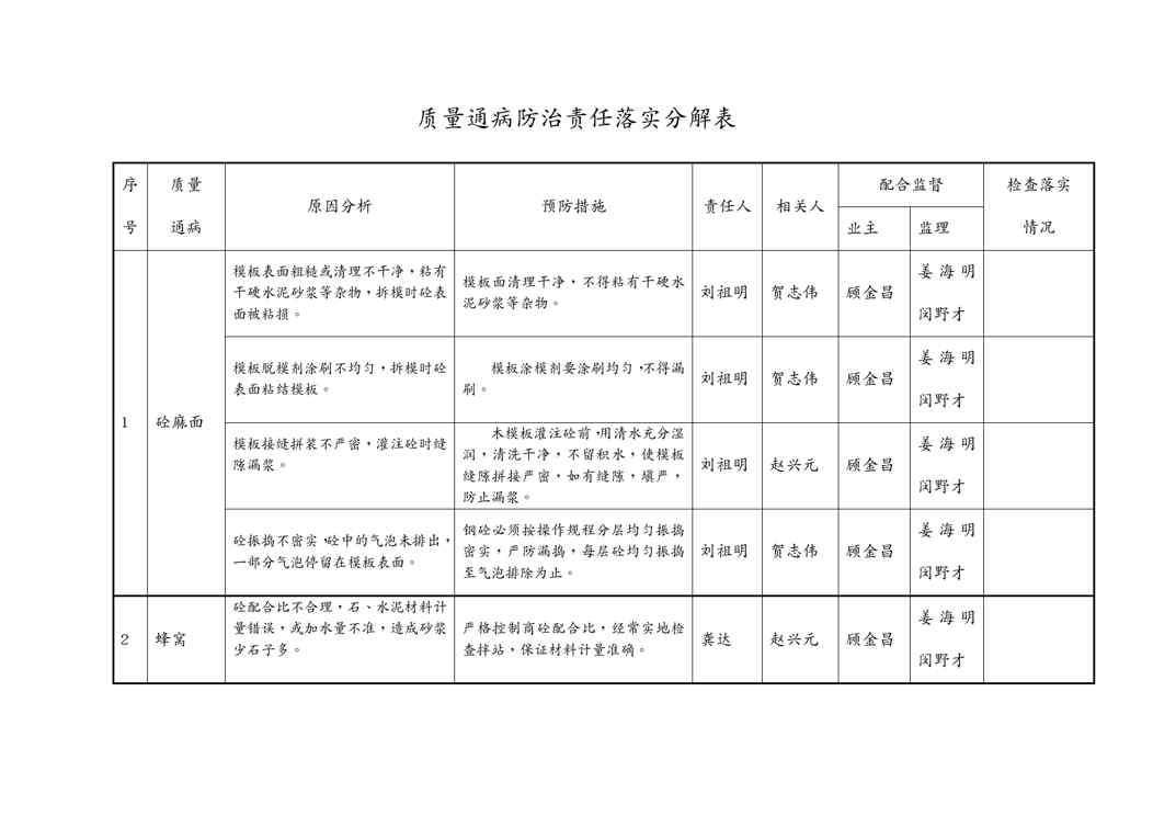 本站资深用户发布了最新的《{品质管理制度表格}建筑工程质量通病防治责任落实分解表》文档,以下内容为预览,详细内容可下载阅读。 声明:本站所有文章,如无特殊说明或标注,均为本站原创发布。任何个人或组织,在未征得本站同意时,禁止复制、盗用、采集、发布本站内容到任何网站、书籍等各类媒体平台。如若本站内容侵犯了原著者的合法权益,可联系我们进行处理。