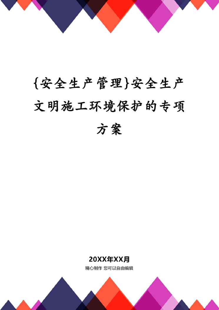 本站正式发布了《{安全生产管理}安全生产文明施工环境保护的专项方案》文档,文档详细内容可下载阅读。 声明:本站所有文章,如无特殊说明或标注,均为本站原创发布。任何个人或组织,在未征得本站同意时,禁止复制、盗用、采集、发布本站内容到任何网站、书籍等各类媒体平台。如若本站内容侵犯了原著者的合法权益,可联系我们进行处理。