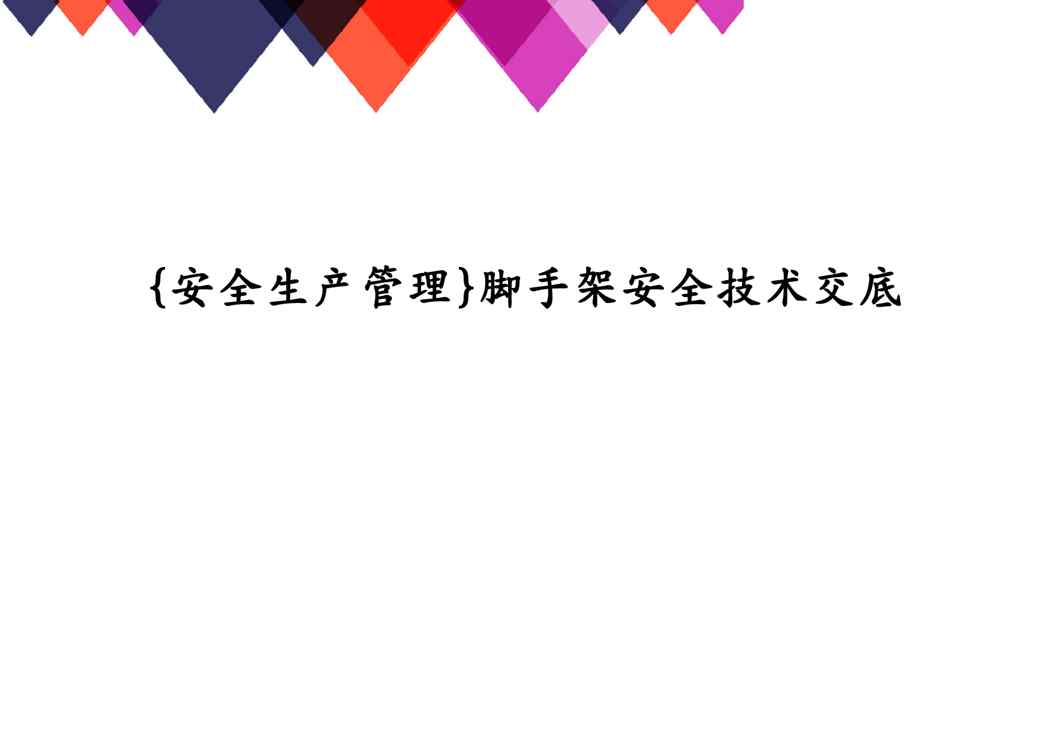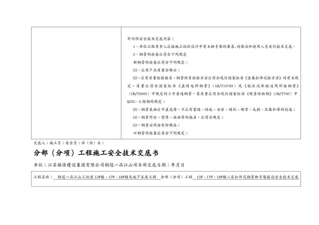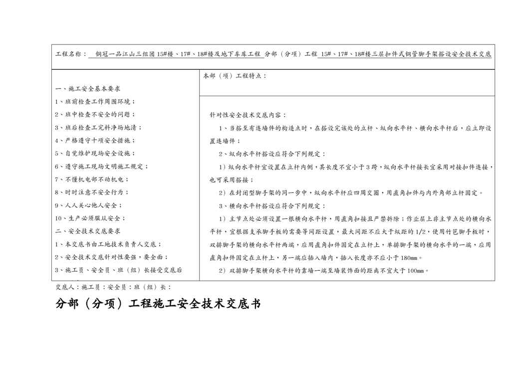 本站资深用户发布了最新的《{安全生产管理}脚手架安全技术交底》文档,以下内容为预览,详细内容可下载阅读。 声明:本站所有文章,如无特殊说明或标注,均为本站原创发布。任何个人或组织,在未征得本站同意时,禁止复制、盗用、采集、发布本站内容到任何网站、书籍等各类媒体平台。如若本站内容侵犯了原著者的合法权益,可联系我们进行处理。