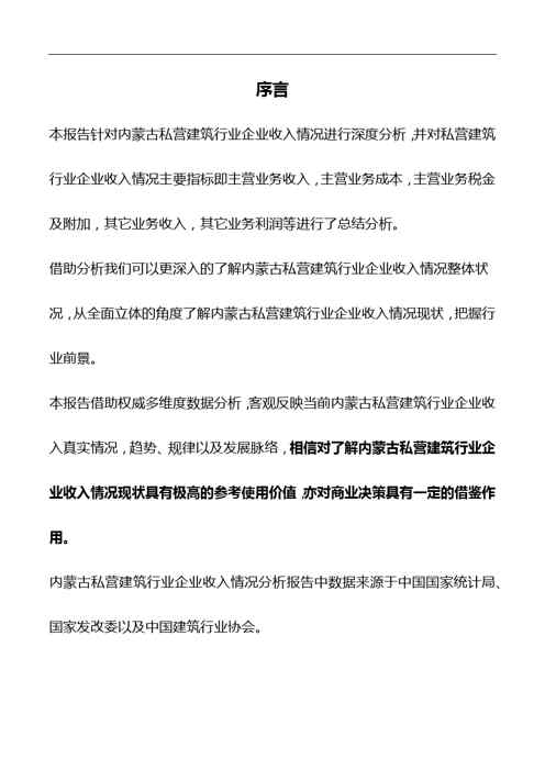 本站资深用户发布了最新的《2018版内蒙古私营建筑行业企业收入情况分析报告》文档,以下内容为预览,详细内容可下载阅读。 声明:本站所有文章,如无特殊说明或标注,均为本站原创发布。任何个人或组织,在未征得本站同意时,禁止复制、盗用、采集、发布本站内容到任何网站、书籍等各类媒体平台。如若本站内容侵犯了原著者的合法权益,可联系我们进行处理。