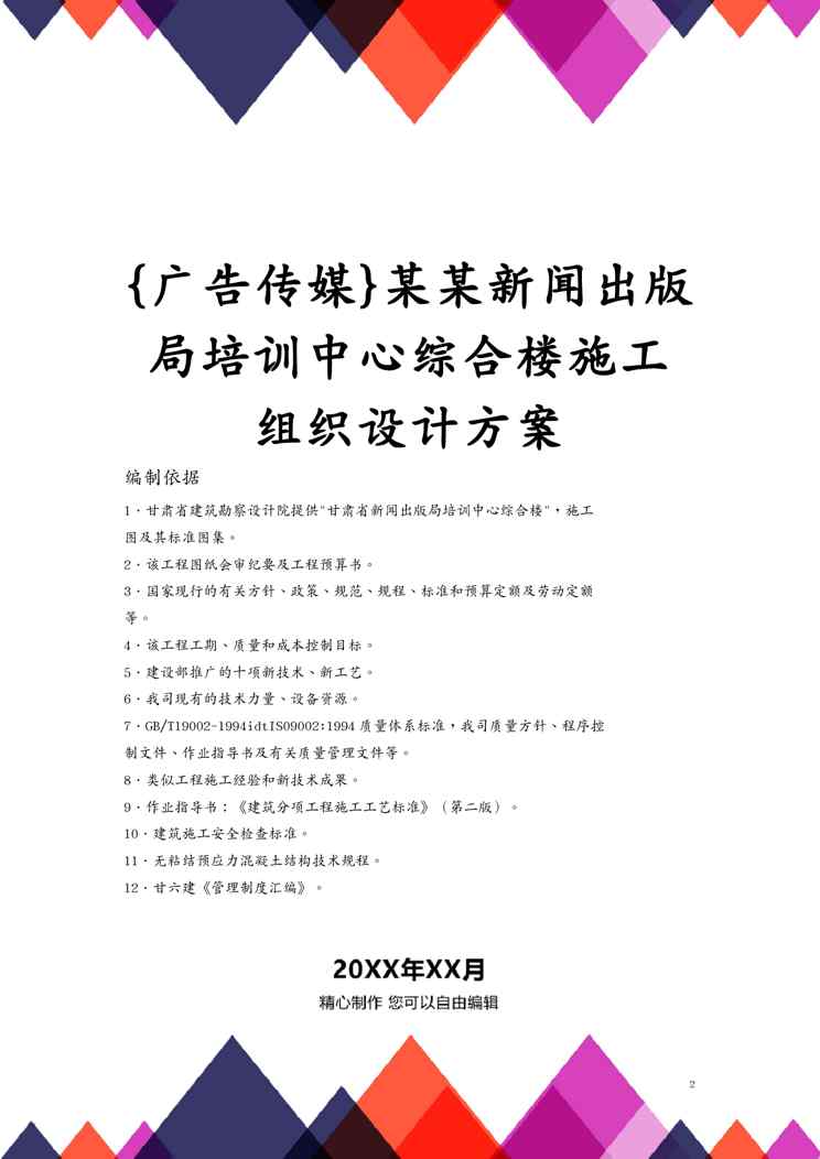 不久前,最新文档《{广告传媒}某某新闻出版局培训中心综合楼施工组织设计方案》全文正式在本站发布,感兴趣的用户可以下载阅读。 声明:本站所有文章,如无特殊说明或标注,均为本站原创发布。任何个人或组织,在未征得本站同意时,禁止复制、盗用、采集、发布本站内容到任何网站、书籍等各类媒体平台。如若本站内容侵犯了原著者的合法权益,可联系我们进行处理。