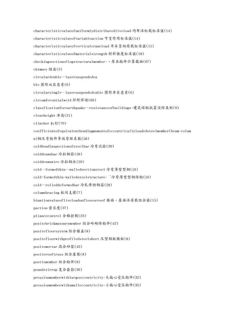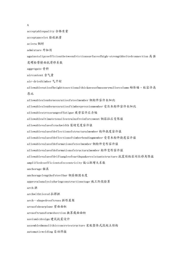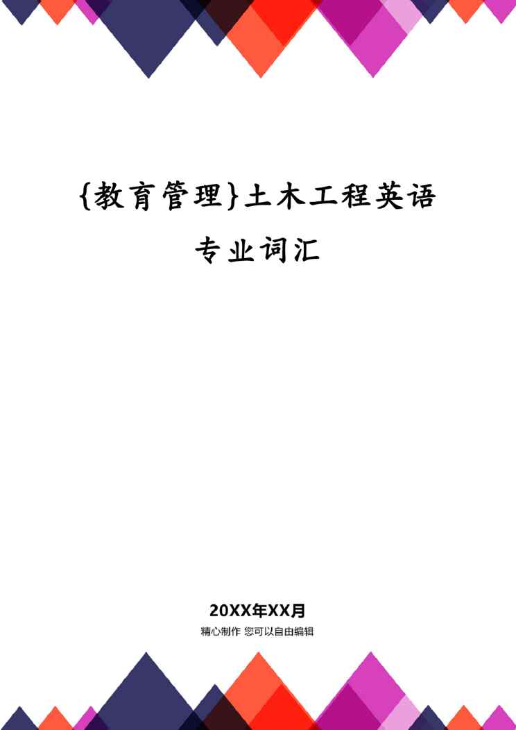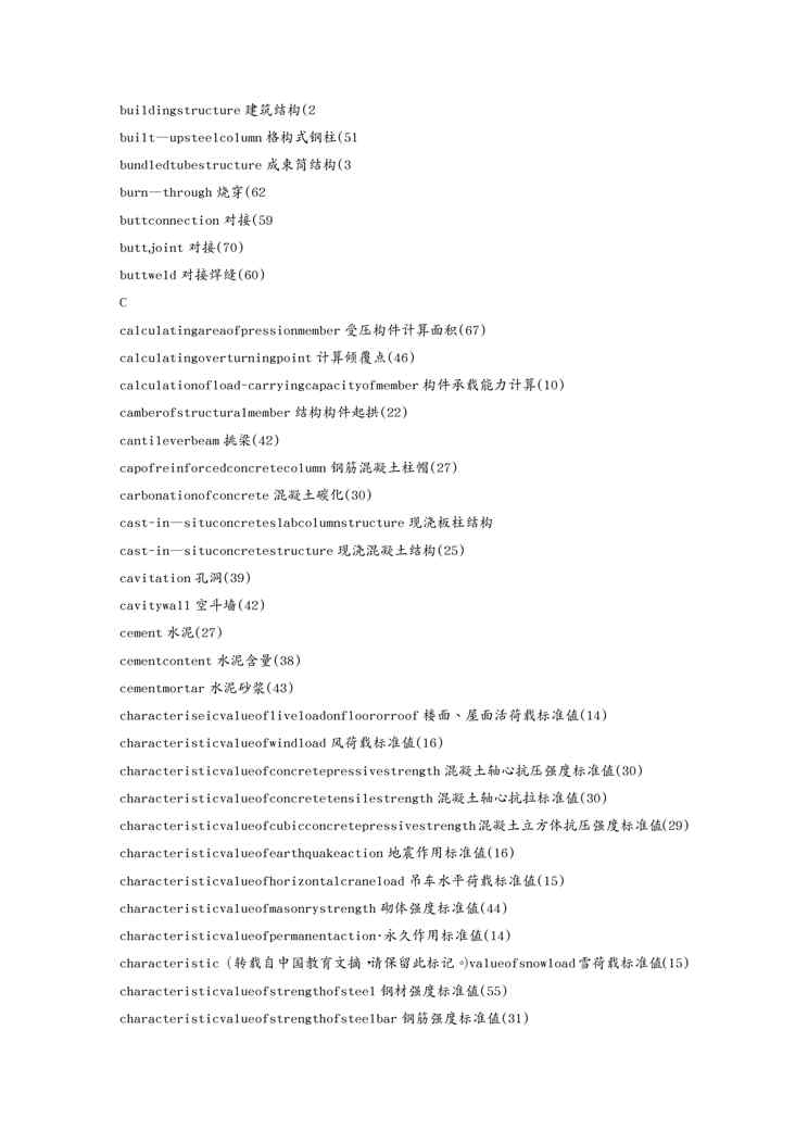 本站资深用户发布了最新的《{教育管理}土木工程英语专业词汇》文档,以下内容为预览,详细内容可下载阅读。 声明:本站所有文章,如无特殊说明或标注,均为本站原创发布。任何个人或组织,在未征得本站同意时,禁止复制、盗用、采集、发布本站内容到任何网站、书籍等各类媒体平台。如若本站内容侵犯了原著者的合法权益,可联系我们进行处理。