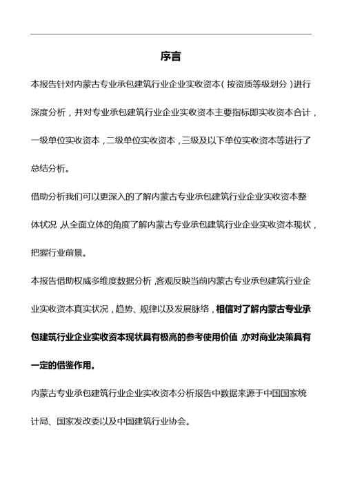 本站资深用户发布了最新的《2018版内蒙古专业承包建筑行业企业实收资本(按资质等级划分)分析报告》文档,以下内容为预览,详细内容可下载阅读。 声明:本站所有文章,如无特殊说明或标注,均为本站原创发布。任何个人或组织,在未征得本站同意时,禁止复制、盗用、采集、发布本站内容到任何网站、书籍等各类媒体平台。如若本站内容侵犯了原著者的合法权益,可联系我们进行处理。