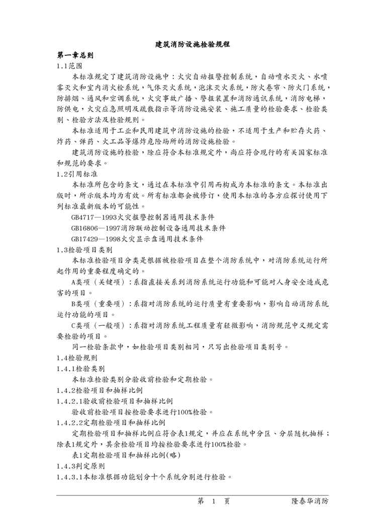 本站资深用户发布了最新的《{消防安全制度}建筑消防设施检验规程总则》文档,以下内容为预览,详细内容可下载阅读。 声明:本站所有文章,如无特殊说明或标注,均为本站原创发布。任何个人或组织,在未征得本站同意时,禁止复制、盗用、采集、发布本站内容到任何网站、书籍等各类媒体平台。如若本站内容侵犯了原著者的合法权益,可联系我们进行处理。