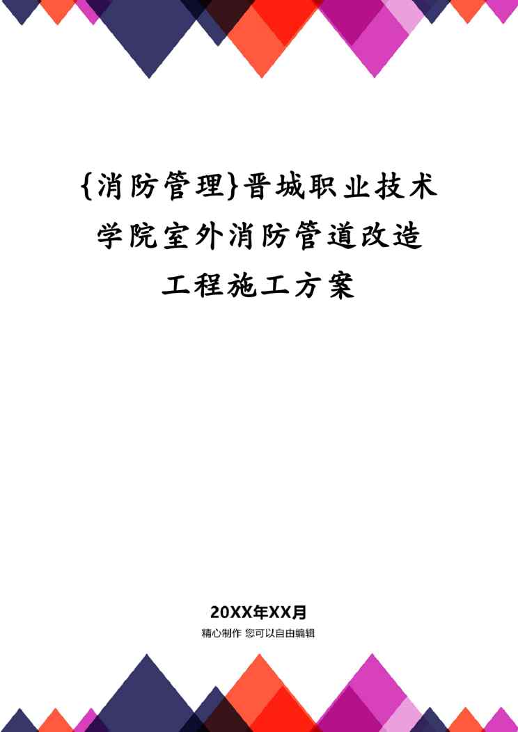 本站资深用户发布了最新的《{消防管理}晋城职业技术学院室外消防管道改造工程施工方案》文档,以下内容为预览,详细内容可下载阅读。 声明:本站所有文章,如无特殊说明或标注,均为本站原创发布。任何个人或组织,在未征得本站同意时,禁止复制、盗用、采集、发布本站内容到任何网站、书籍等各类媒体平台。如若本站内容侵犯了原著者的合法权益,可联系我们进行处理。