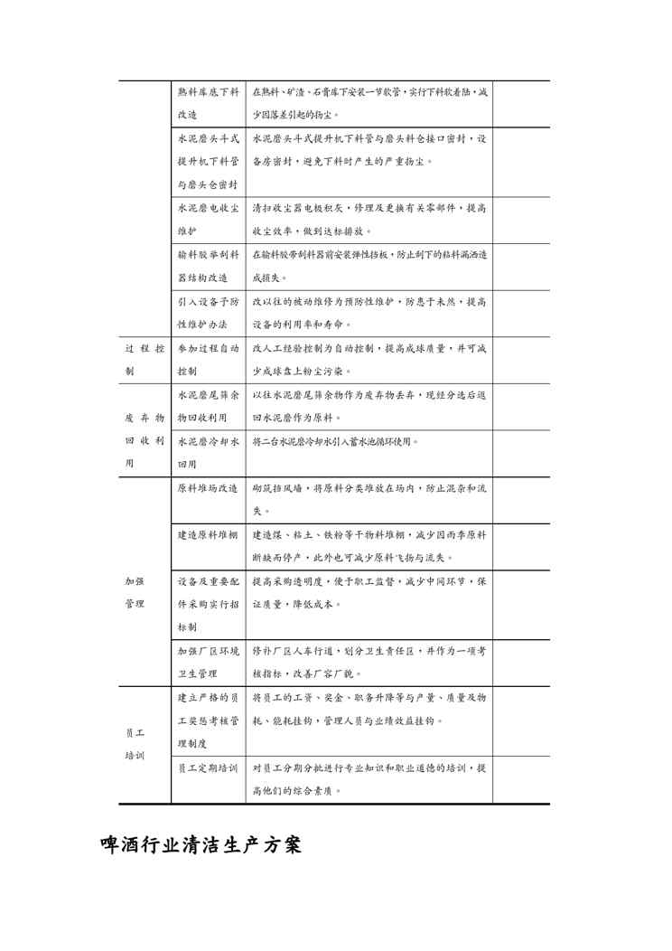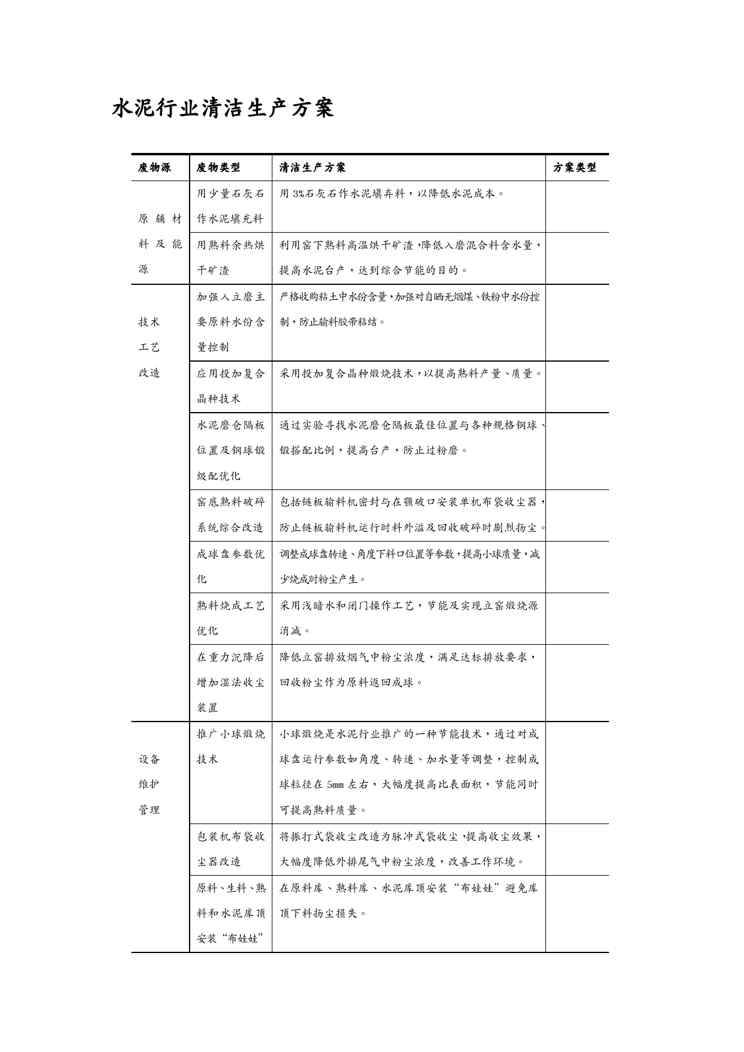 本站正式发布了《{清洁生产管理}水泥行业清洁生产方案》文档,文档详细内容可下载阅读。 声明:本站所有文章,如无特殊说明或标注,均为本站原创发布。任何个人或组织,在未征得本站同意时,禁止复制、盗用、采集、发布本站内容到任何网站、书籍等各类媒体平台。如若本站内容侵犯了原著者的合法权益,可联系我们进行处理。