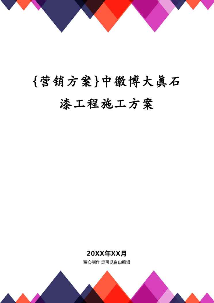 本站资深用户发布了最新的《{营销方案}中徽博大真石漆工程施工方案》文档,以下内容为预览,详细内容可下载阅读。 声明:本站所有文章,如无特殊说明或标注,均为本站原创发布。任何个人或组织,在未征得本站同意时,禁止复制、盗用、采集、发布本站内容到任何网站、书籍等各类媒体平台。如若本站内容侵犯了原著者的合法权益,可联系我们进行处理。