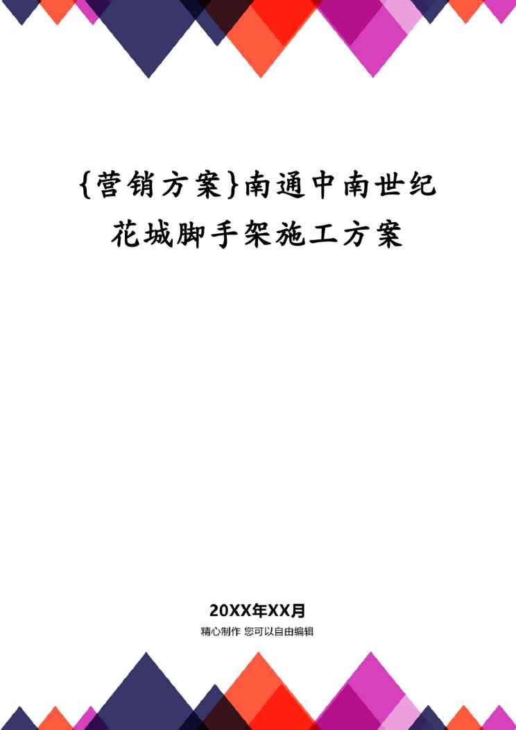 本站资深用户发布了最新的《{营销方案}南通中南世纪花城脚手架施工方案》文档,以下内容为预览,详细内容可下载阅读。 声明:本站所有文章,如无特殊说明或标注,均为本站原创发布。任何个人或组织,在未征得本站同意时,禁止复制、盗用、采集、发布本站内容到任何网站、书籍等各类媒体平台。如若本站内容侵犯了原著者的合法权益,可联系我们进行处理。