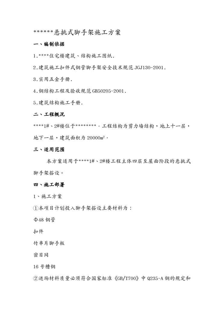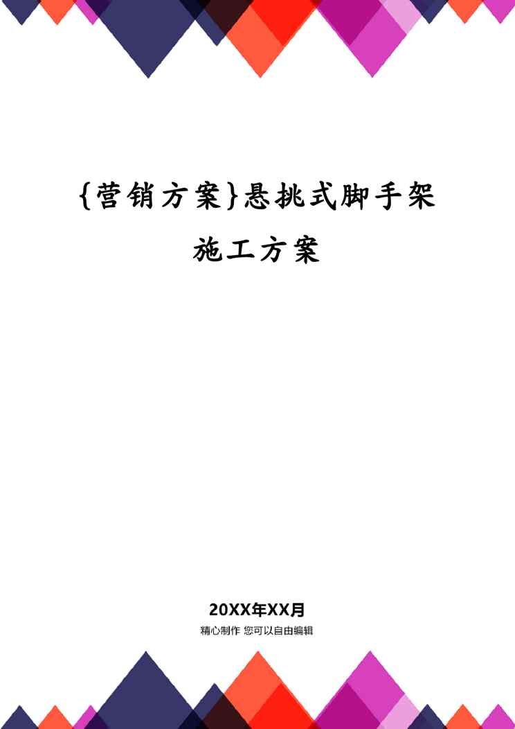 本站资深用户发布了最新的《{营销方案}悬挑式脚手架施工方案》文档,以下内容为预览,详细内容可下载阅读。 声明:本站所有文章,如无特殊说明或标注,均为本站原创发布。任何个人或组织,在未征得本站同意时,禁止复制、盗用、采集、发布本站内容到任何网站、书籍等各类媒体平台。如若本站内容侵犯了原著者的合法权益,可联系我们进行处理。
