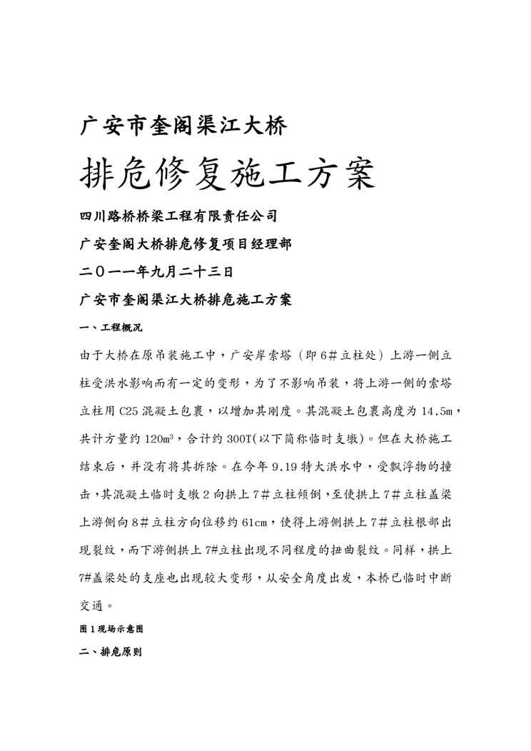 本站资深用户发布了最新的《{营销方案}排危修复施工方案》文档,以下内容为预览,详细内容可下载阅读。 声明:本站所有文章,如无特殊说明或标注,均为本站原创发布。任何个人或组织,在未征得本站同意时,禁止复制、盗用、采集、发布本站内容到任何网站、书籍等各类媒体平台。如若本站内容侵犯了原著者的合法权益,可联系我们进行处理。