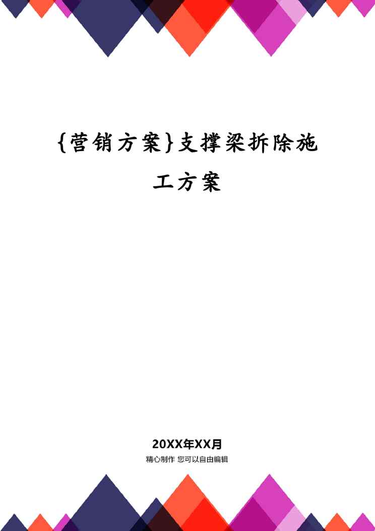本站正式发布了《{营销方案}支撑梁拆除施工方案》文档,文档详细内容可下载阅读。 声明:本站所有文章,如无特殊说明或标注,均为本站原创发布。任何个人或组织,在未征得本站同意时,禁止复制、盗用、采集、发布本站内容到任何网站、书籍等各类媒体平台。如若本站内容侵犯了原著者的合法权益,可联系我们进行处理。
